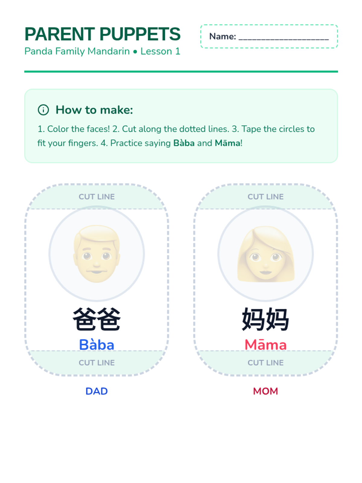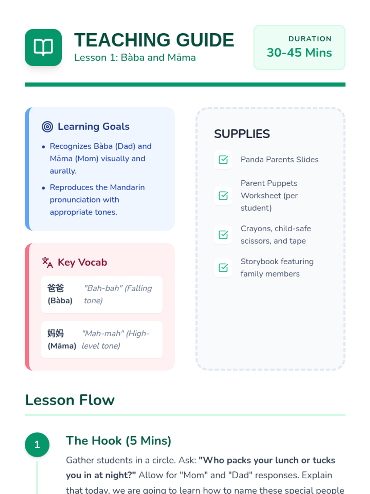A foundational Mandarin Chinese sequence for Pre-K students focused on identifying family members. Students learn vocabulary for parents, siblings, and grandparents through interactive games, songs, and visual inquiry.