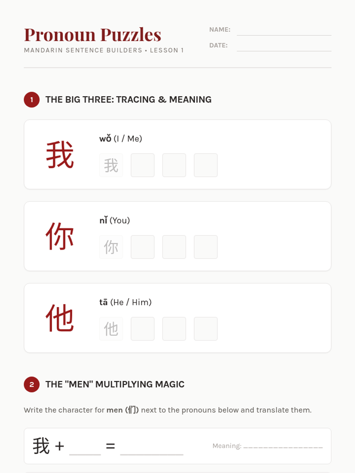 This sequence guides 7th-grade students through the fundamentals of Mandarin Chinese sentence structure. Starting with personal pronouns and moving through essential verbs like 'to be', 'to have', and action verbs, students learn to construct complete thoughts using the Subject-Verb-Object (SVO) pattern.