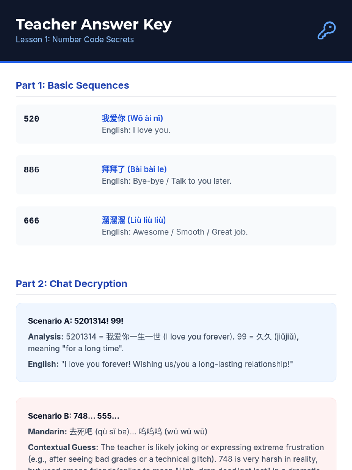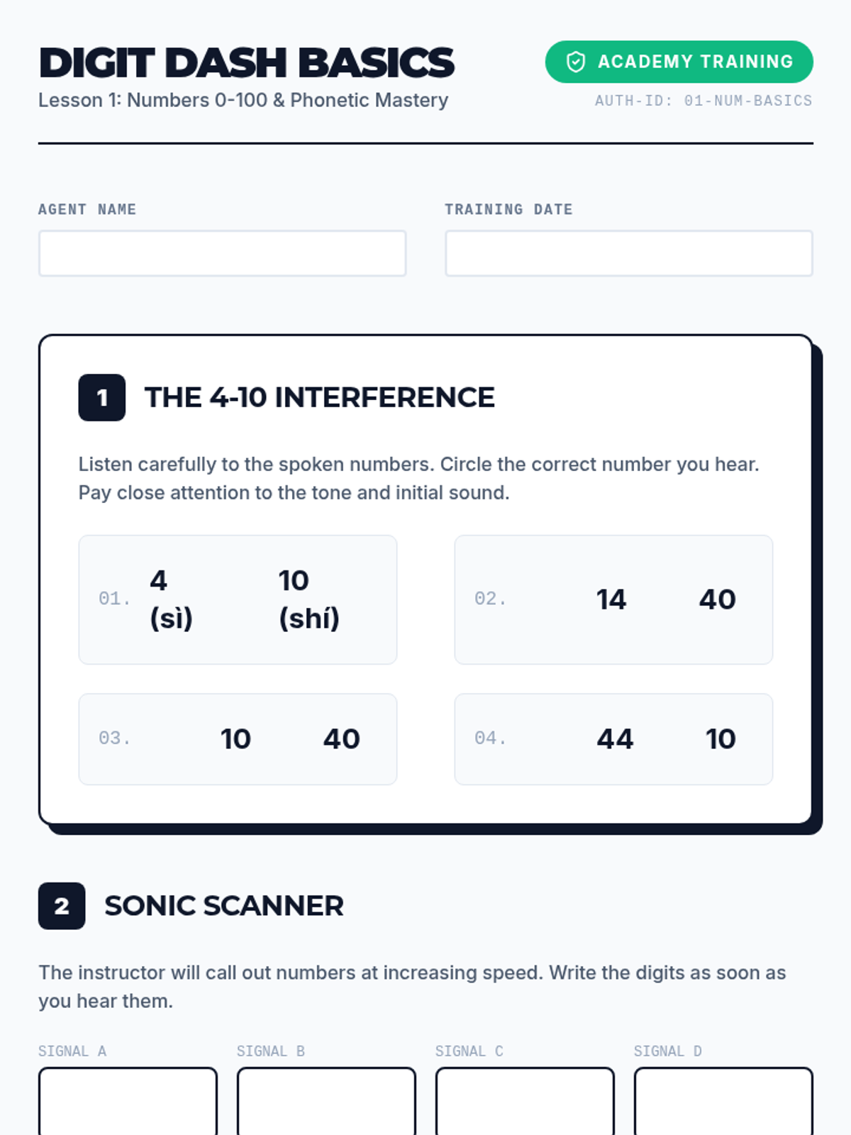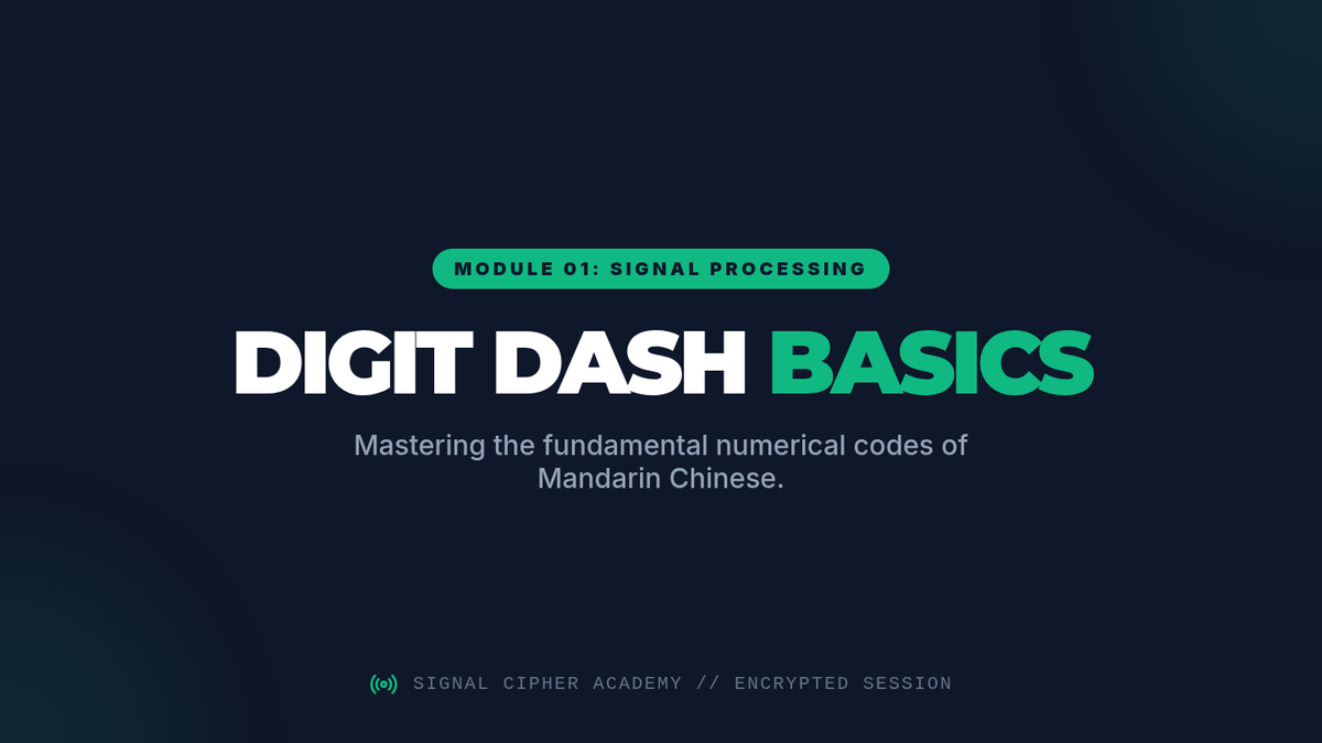 A high-energy Mandarin listening sequence focused on rapid numerical processing, from basic digits to complex schedules and prices. Students take on the role of trainees at Signal Cipher Academy, mastering the 'codes' of daily life.