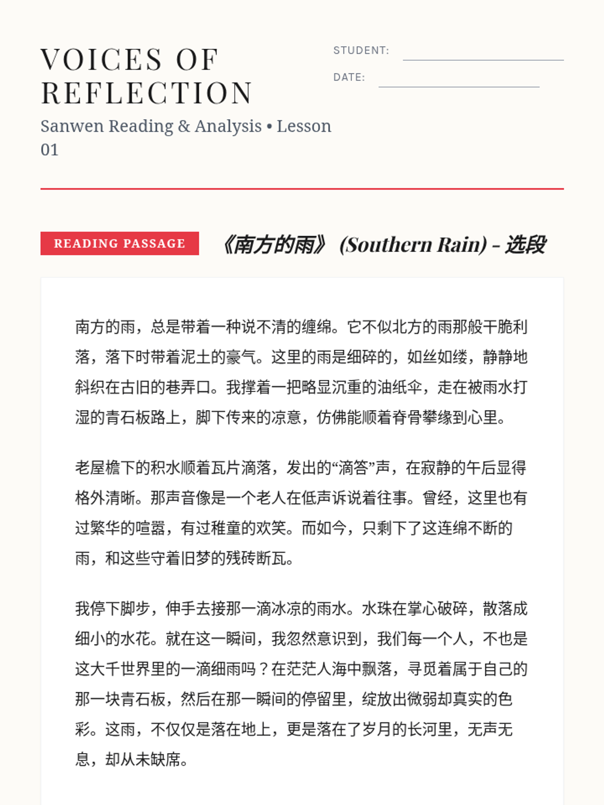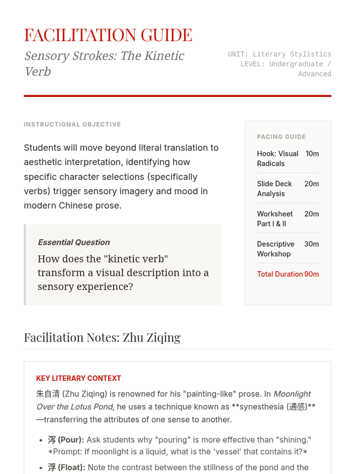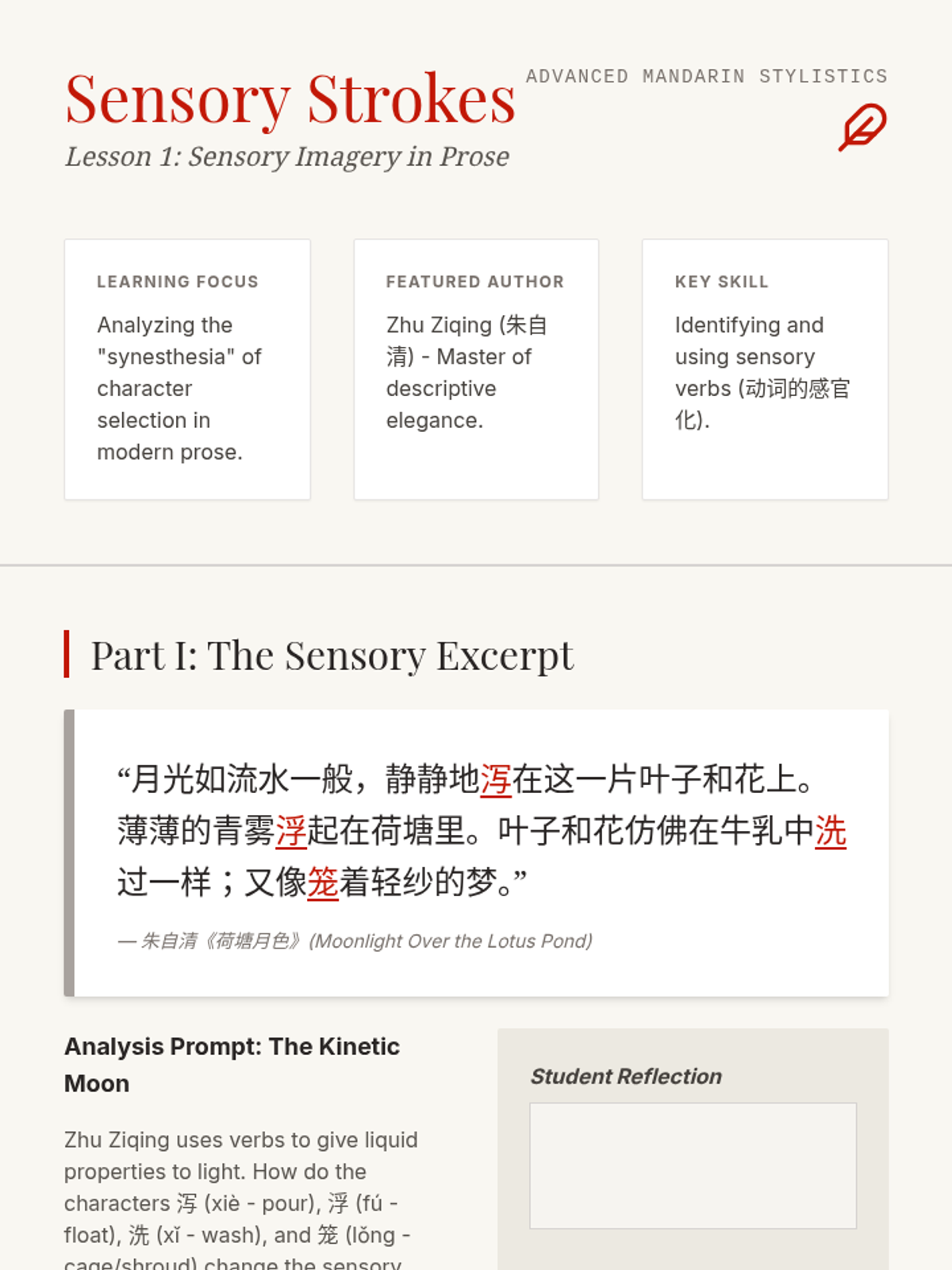 This advanced Mandarin Chinese sequence explores the aesthetic and expressive potential of Chinese characters in literature. Students analyze sensory imagery, rhythmic cadences, and symbolic naming to understand how masters of modern prose and poetry evoke emotion through precise character selection.