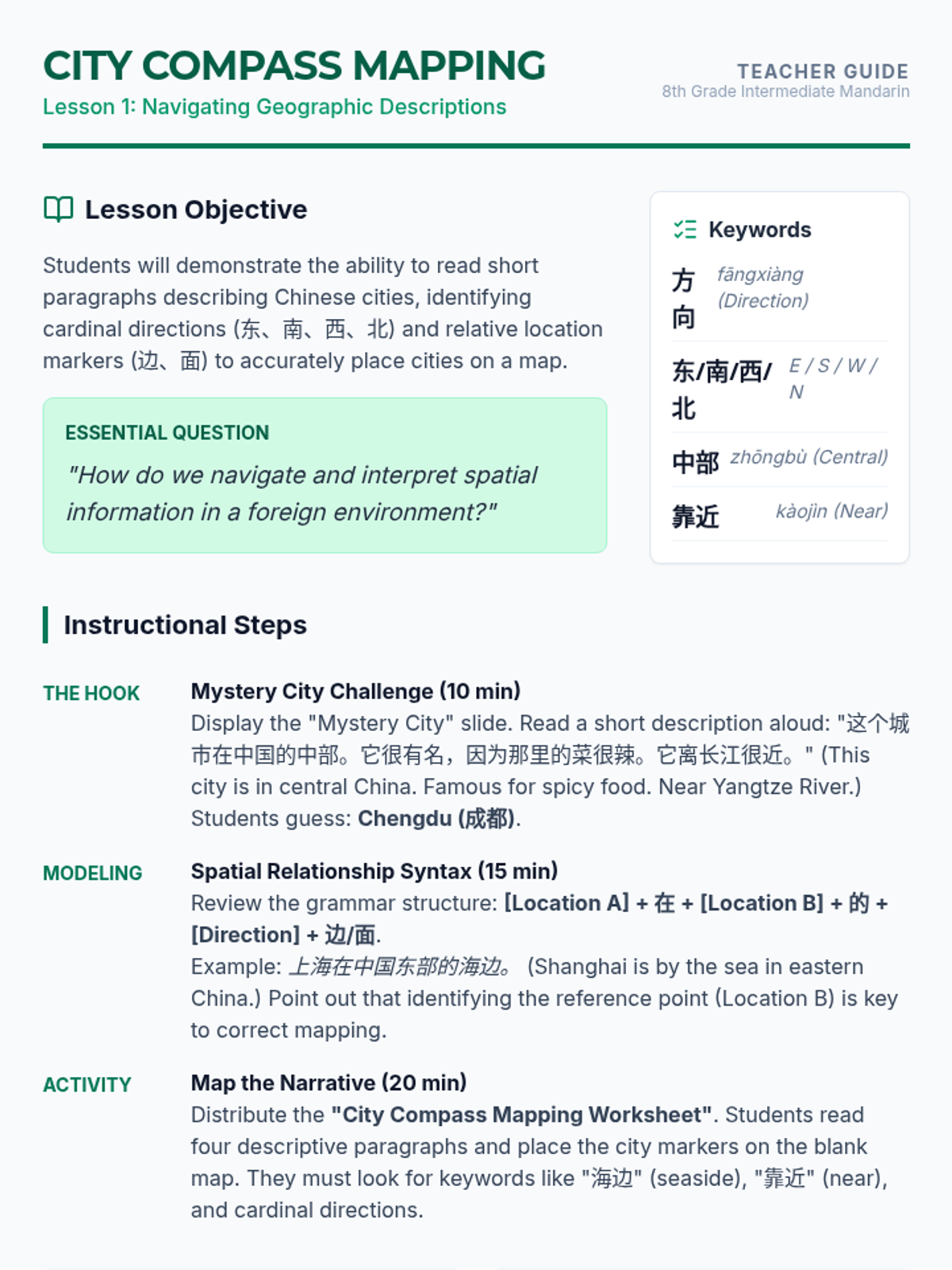 This 8th-grade Intermediate Mandarin sequence focuses on reading and interpreting practical travel information, from geographic descriptions and weather forecasts to train schedules and attraction brochures. Students develop functional literacy skills to navigate real-world logistical documents in a Chinese-speaking environment.