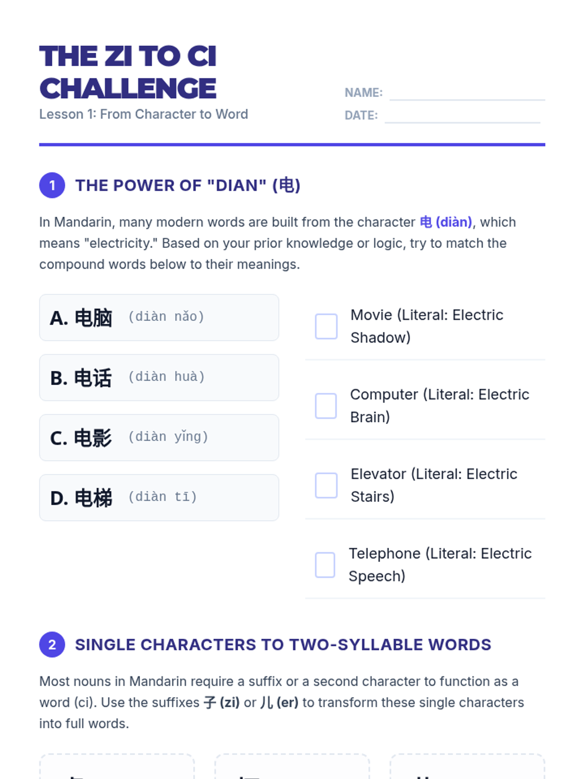This project-based sequence explores the logic of Mandarin Chinese compound word formation (ci) versus single characters (zi). Students investigate how simple meanings combine to create modern terminology and conclude by inventing their own 'future gadgets' using valid character combinations.