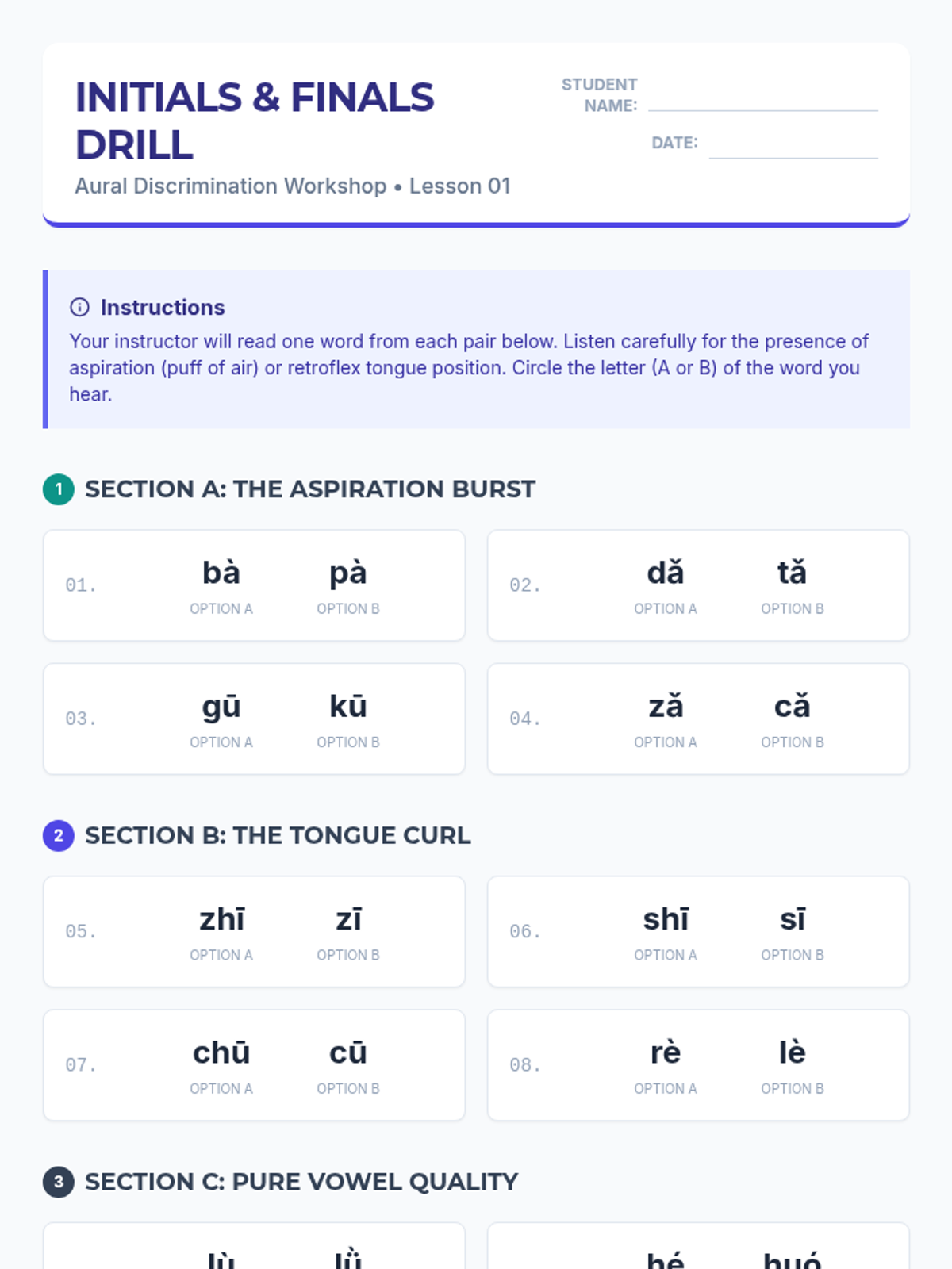 A foundational listening sequence for beginner Mandarin students, focusing on phonemic awareness, tone discrimination, and Pinyin transcription. Students progress from basic initials and finals to complex tone sandhi rules and full-word dictation.