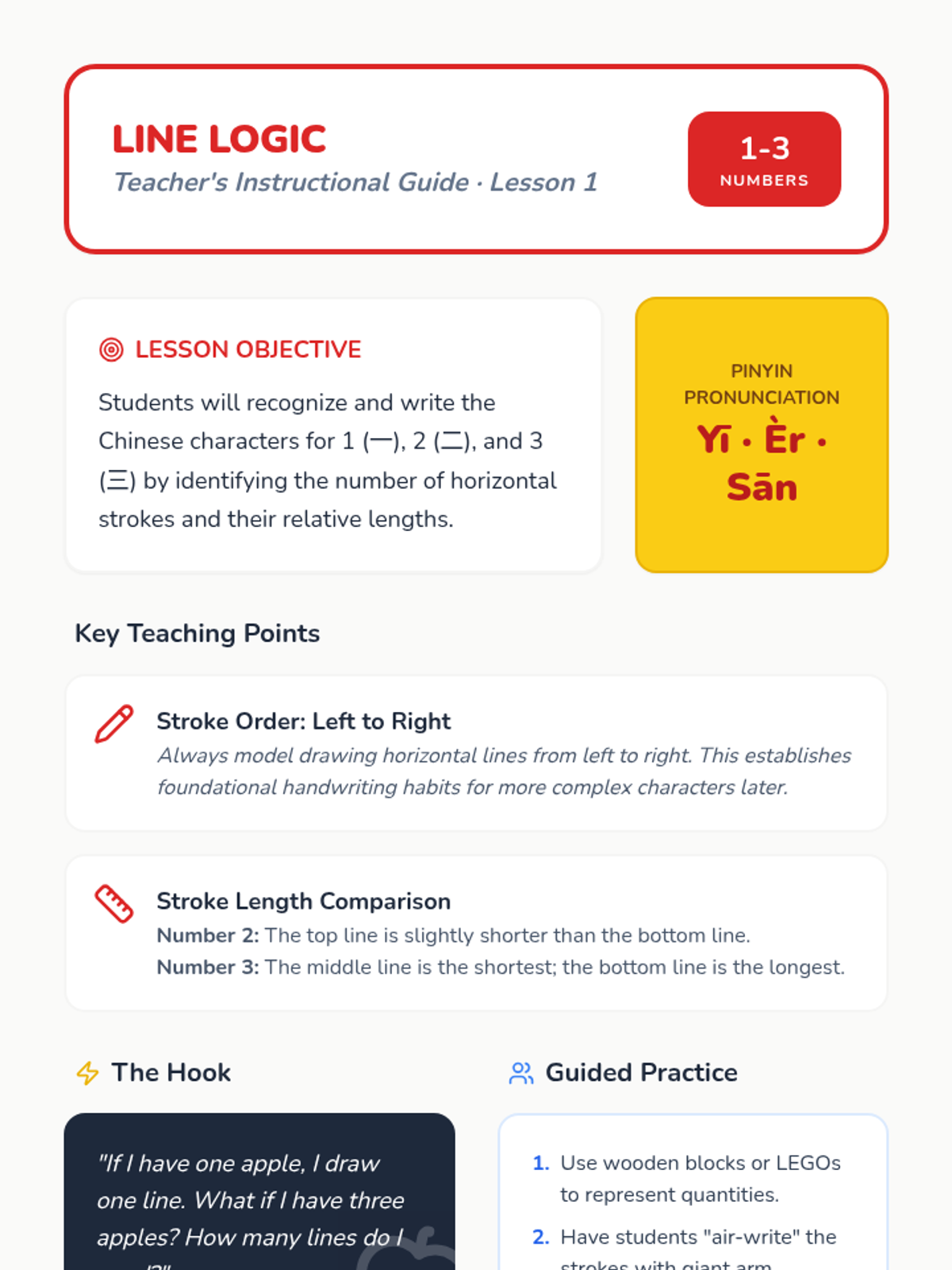 This sequence introduces Kindergarten students to Mandarin Chinese characters for numbers 1-10 through visual mnemonics, hand gestures, and playful simulations. Students progress from simple horizontal lines to complex symbols, culminating in a classroom shop and Bingo game to reinforce character recognition.