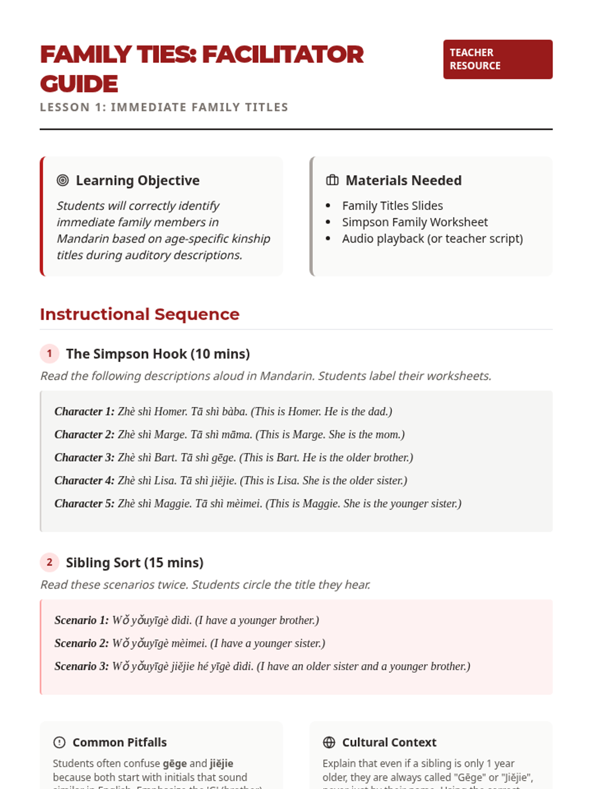 A 5-lesson sequence for 3rd graders exploring Mandarin Chinese characters through the lens of family and identity. Students learn to recognize the 'Person' and 'Female' radicals, master sibling hierarchy terminology, and understand the cultural stories behind compound characters.
