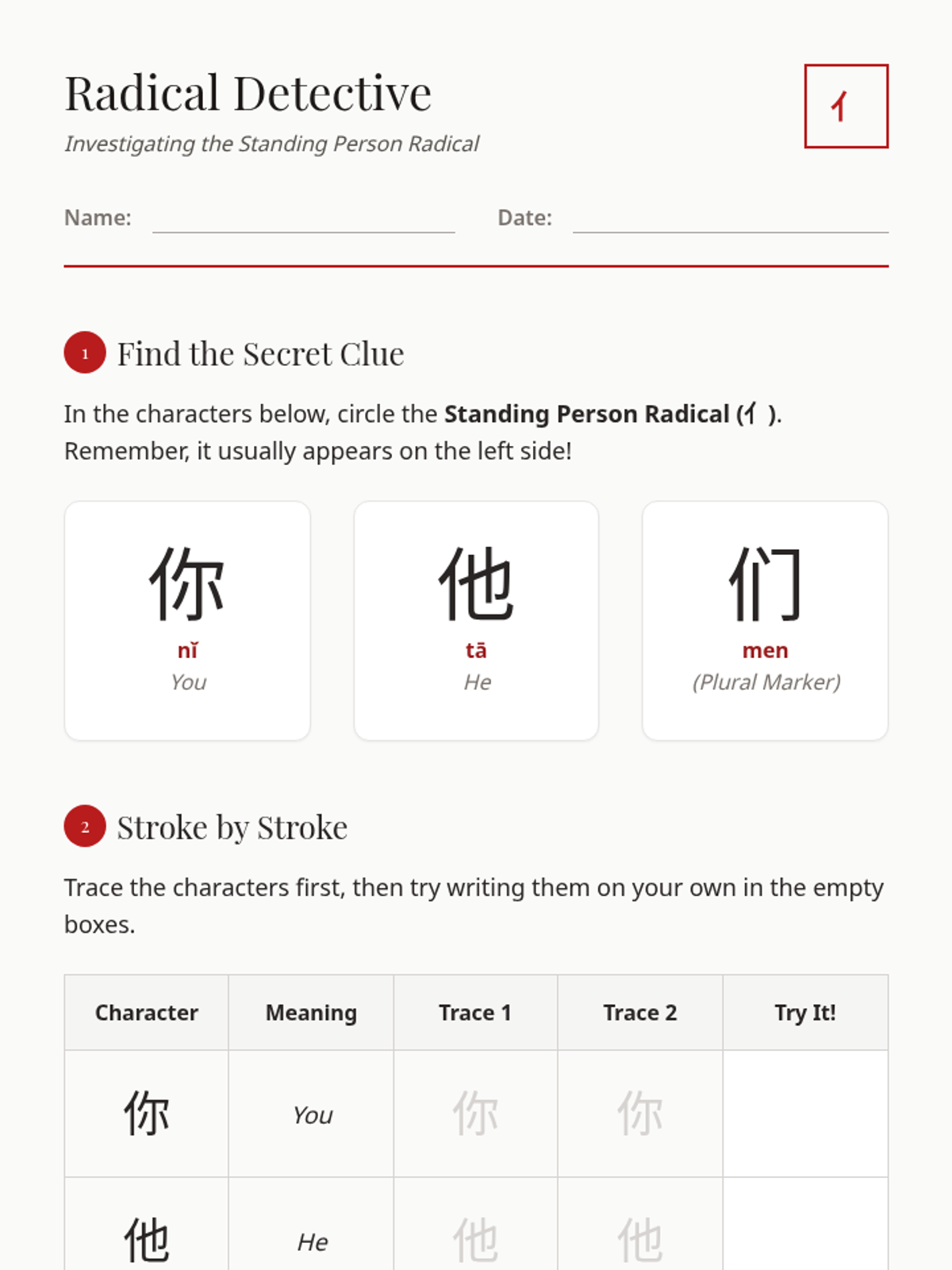 A comprehensive sequence for 8th Grade students focused on the structural logic of Chinese characters. Students learn to use semantic radicals as keys to unlock the meaning of intermediate (HSK 3-4) vocabulary, moving from rote memorization to analytical decoding and mnemonic creation.