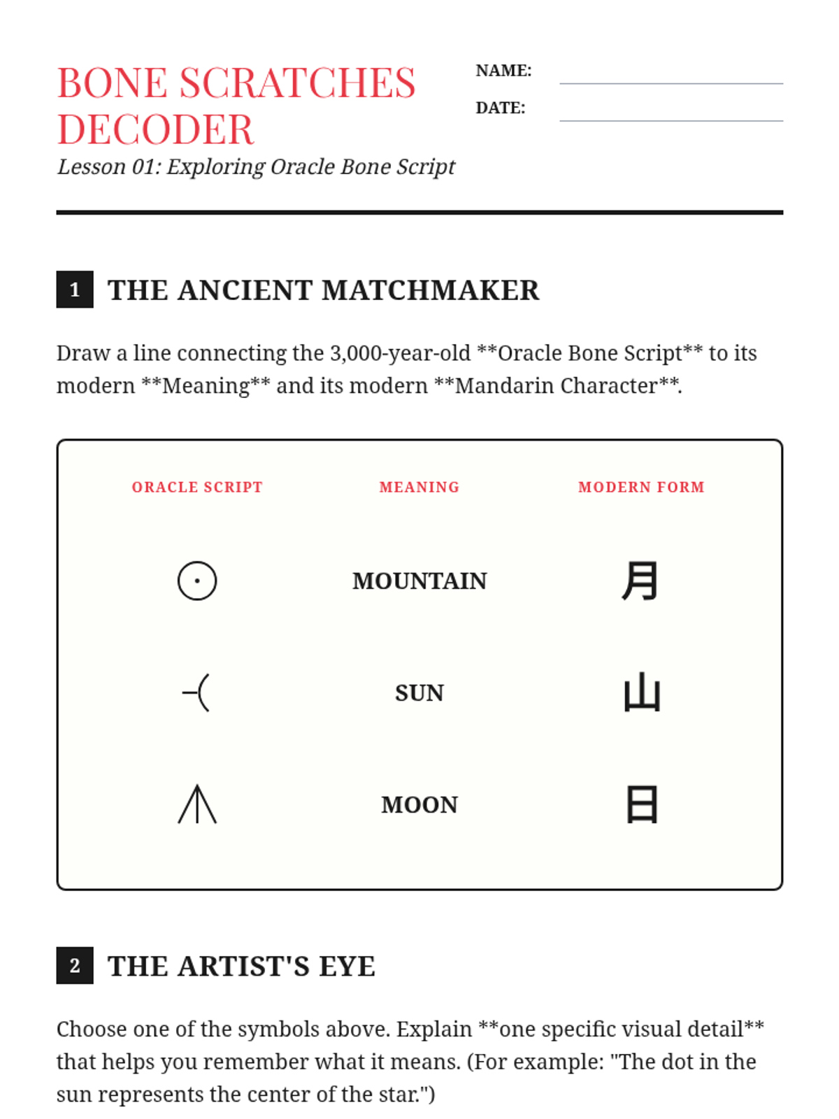 A 5th-grade project-based sequence exploring the pictographic origins and evolution of Mandarin Chinese characters, from ancient oracle bone script to modern simplified forms. Students develop visual mnemonic strategies and create a portfolio demonstrating the transformation of concrete objects into abstract symbols.