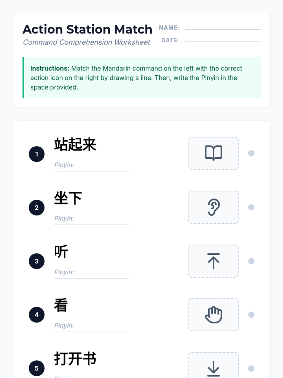 A 5-lesson sequence for 2nd Grade students to learn high-frequency Mandarin action verbs (look, listen, go, come, eat, drink, open, close) through Total Physical Response (TPR) and game-based learning. Students connect written characters directly to physical movements to build immediate comprehension.