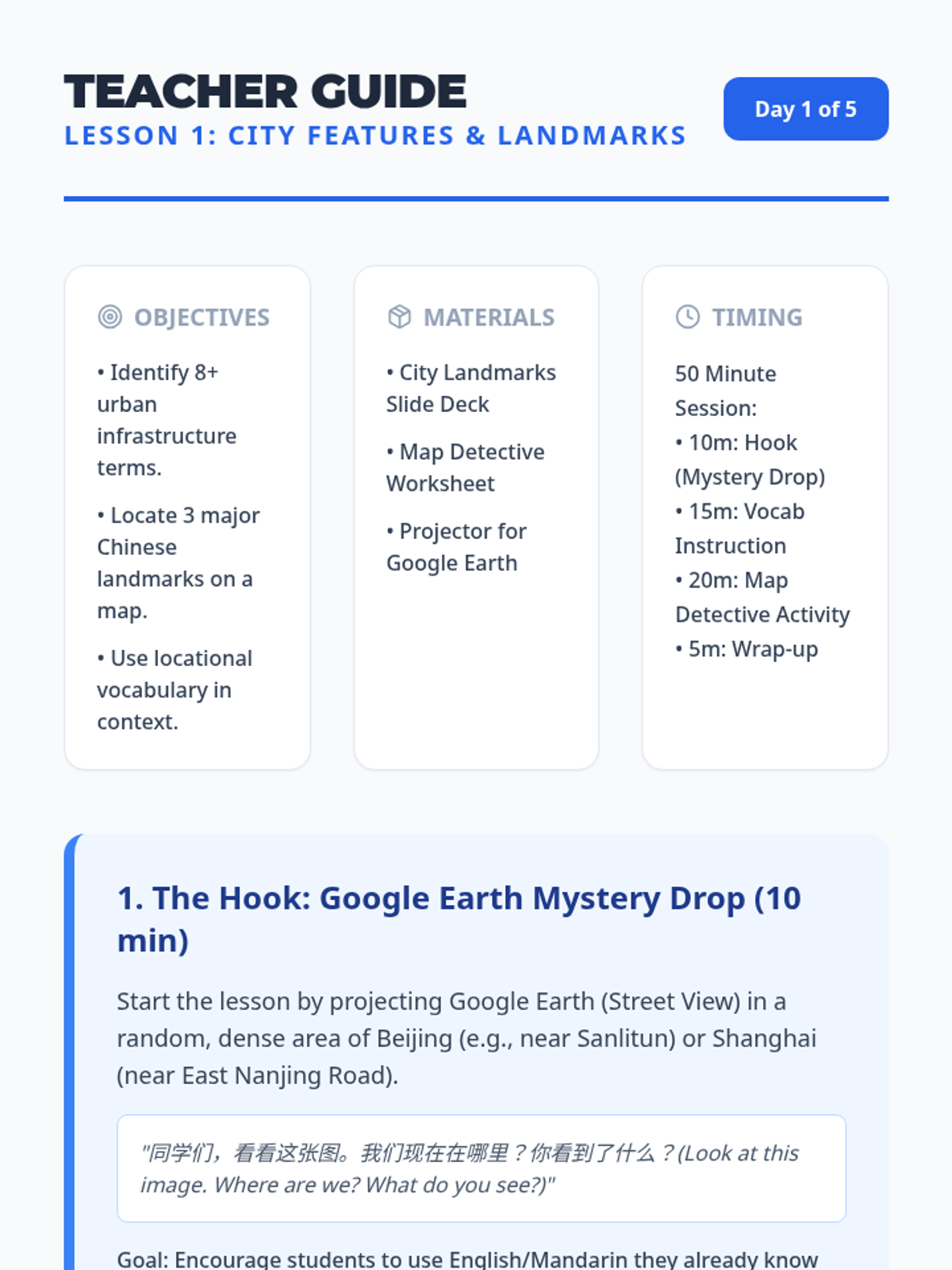 A comprehensive 5-lesson sequence for intermediate Mandarin students to compare the daily lives and educational systems of Chinese and American middle schoolers through authentic-style reading materials.