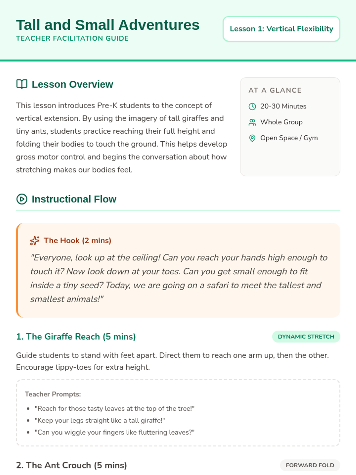 A Pre-K sequence introducing flexibility and body awareness through imaginative animal-inspired movements. Students explore vertical, lateral, seated, and rotational stretches to improve gross motor control and learn how to cool down their bodies.