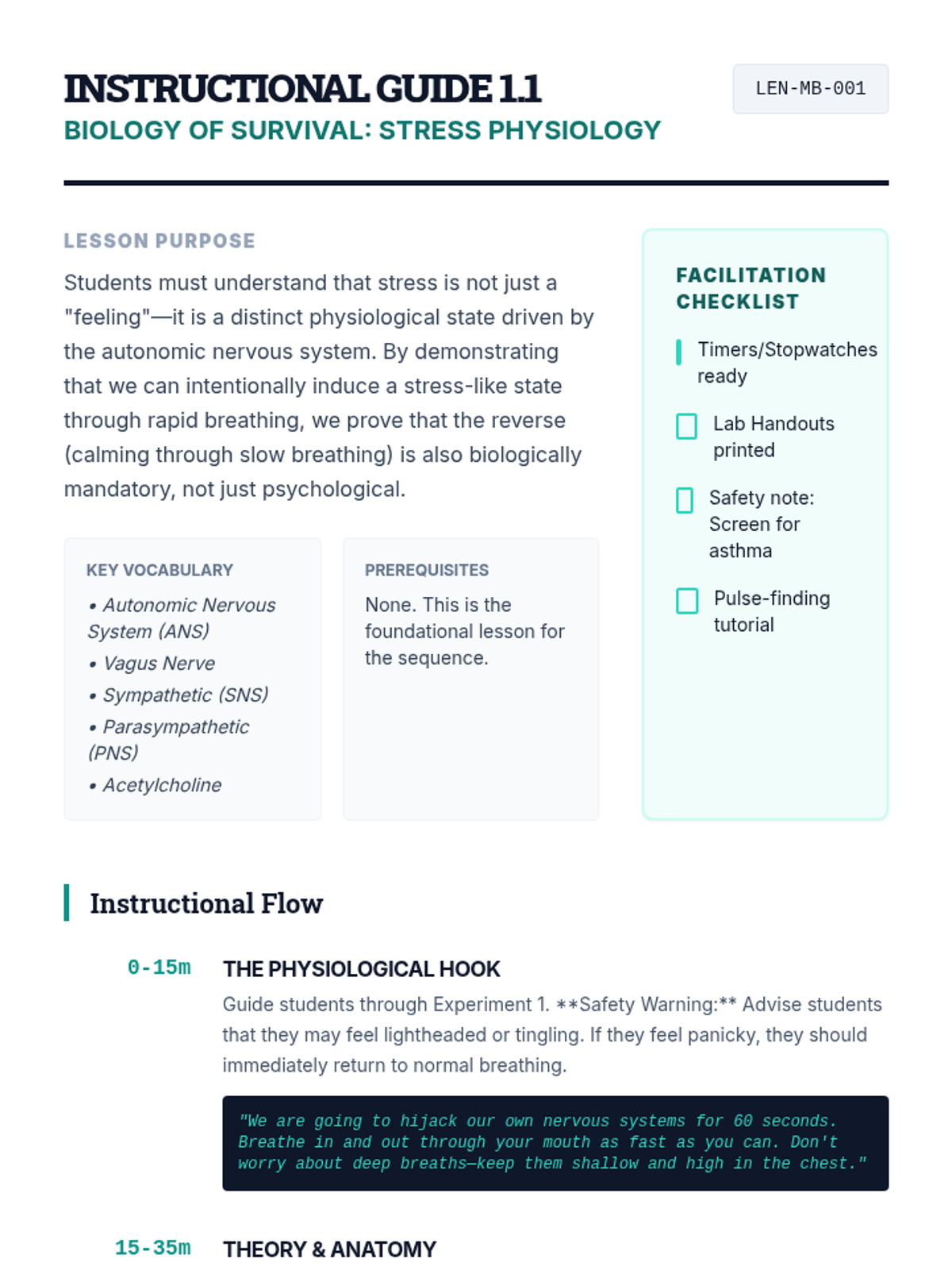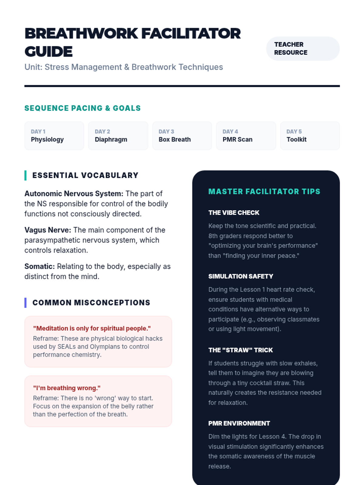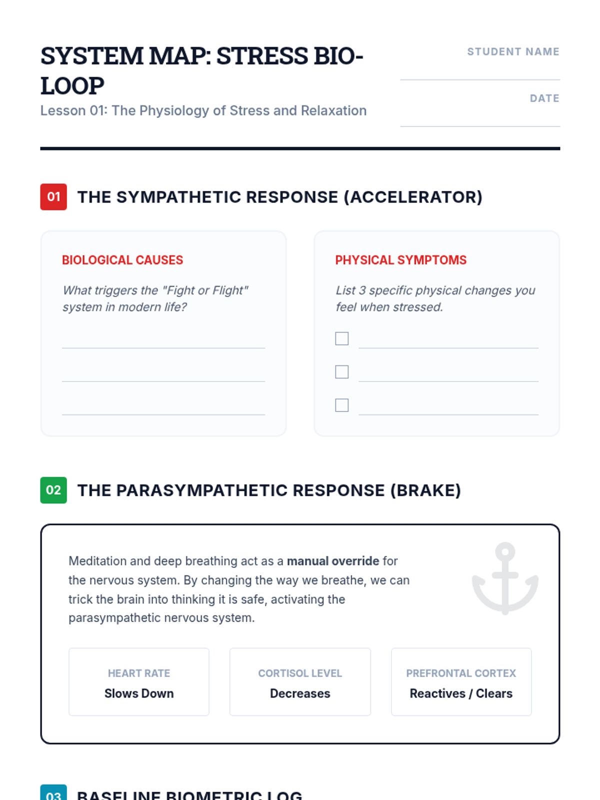 A 12th-grade health sequence exploring the biological mechanisms of the stress response and how breathing techniques can mechanically trigger the parasympathetic nervous system. Students move from physiological theory to mastering concrete, bio-mechanical interventions for stress.
