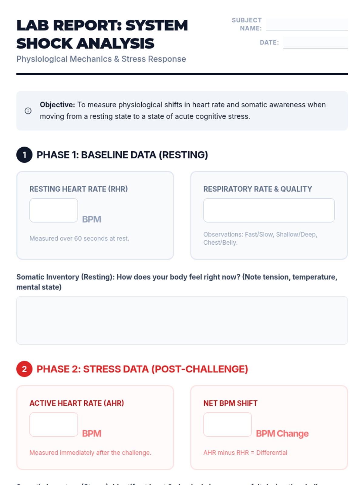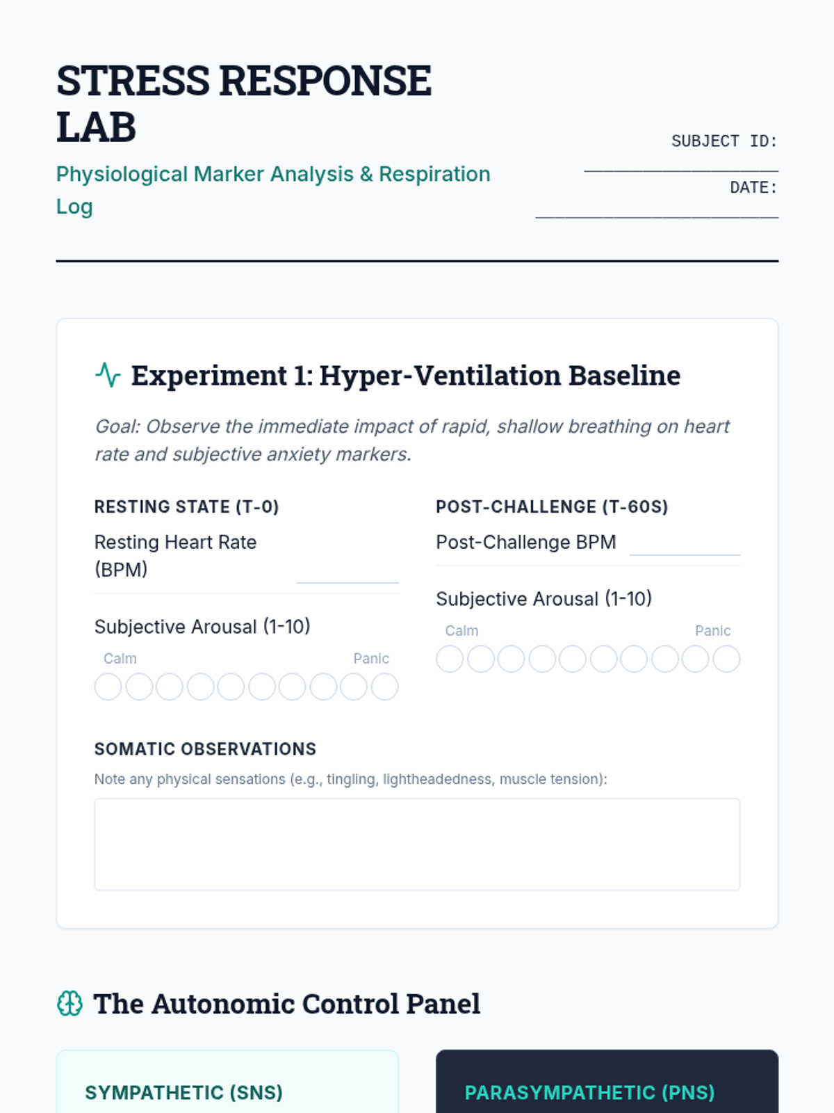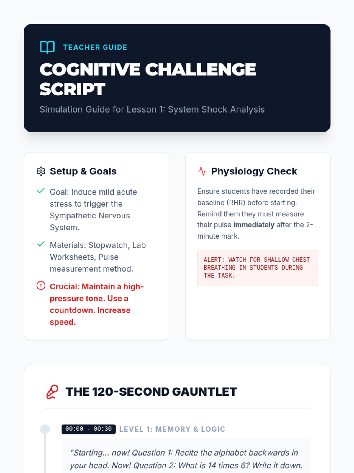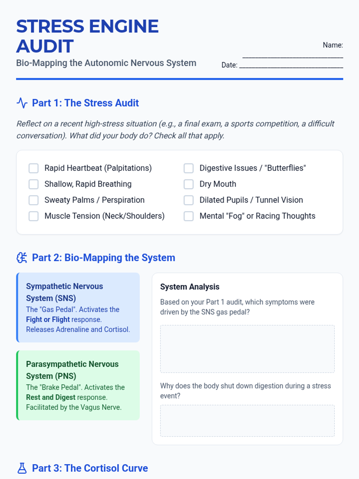 A 12th-grade health sequence exploring the biological mechanisms of the stress response and how breathing techniques can mechanically trigger the parasympathetic nervous system. Students move from physiological theory to mastering concrete, bio-mechanical interventions for stress.