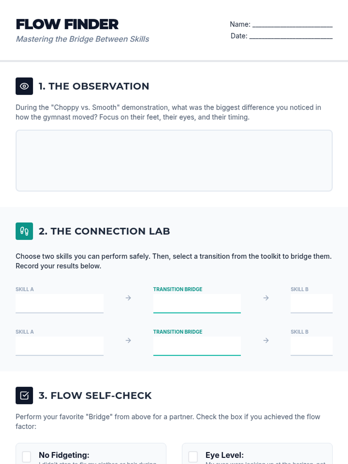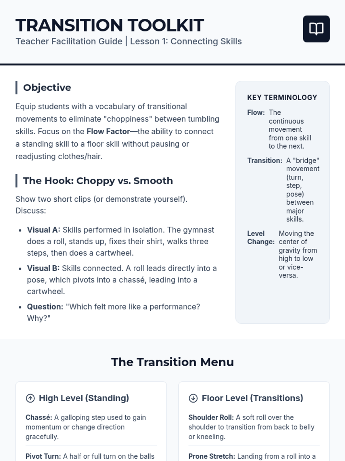 This 7th-grade physical education sequence focuses on the artistic side of gymnastics, teaching students to transition between isolated tumbling skills to create a cohesive routine. Students will explore choreography, aesthetic extensions, and peer feedback to refine their movements before a final showcase.