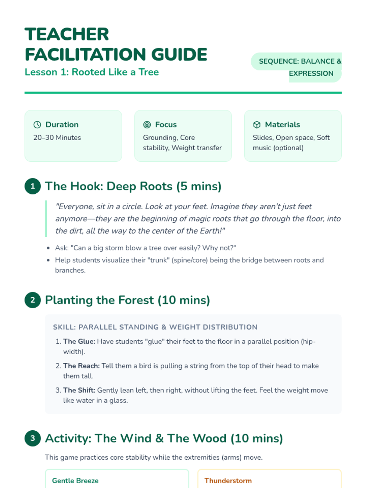 This Pre-K dance sequence explores balance, alignment, and emotional expression through nature-based imagery and storytelling. Students learn to ground themselves like trees, balance like flamingos, roll like logs, and express feelings through movement.