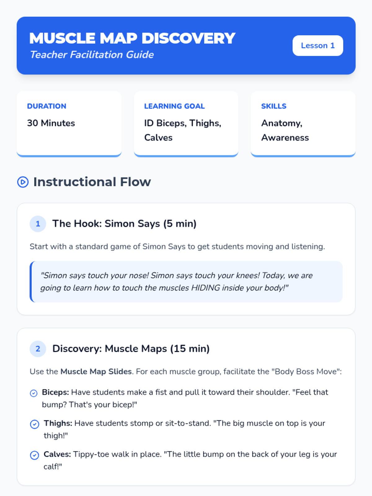 A mastery-based sequence for Kindergarteners to learn muscle isolation and progressive relaxation. Students move from basic anatomical identification to complex whole-body coordination of tension and release.
