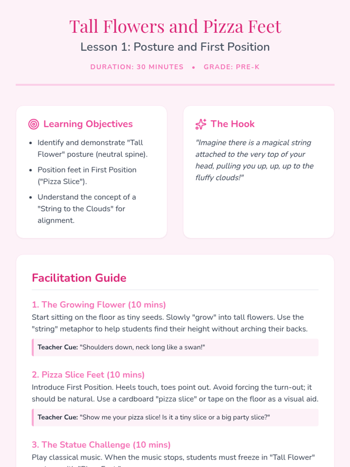 A whimsical introduction to ballet fundamentals for Pre-K students, using imaginative storytelling and metaphors to teach posture, first position, plié, relevé, and jumping. Students develop body awareness and grace through playful movement.