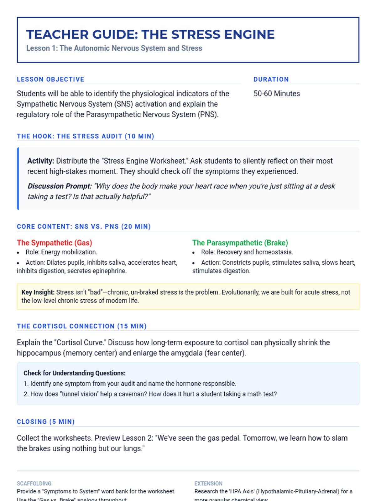 A high school health sequence exploring the biological and neurological foundations of stress and meditation. Students analyze the autonomic nervous system, measure physiological responses to breathing techniques, and understand how neuroplasticity allows for long-term stress regulation.