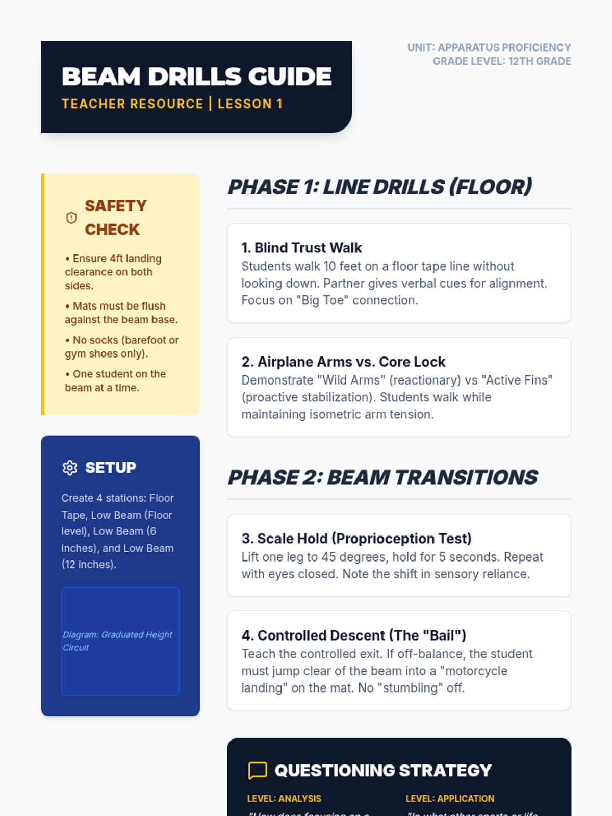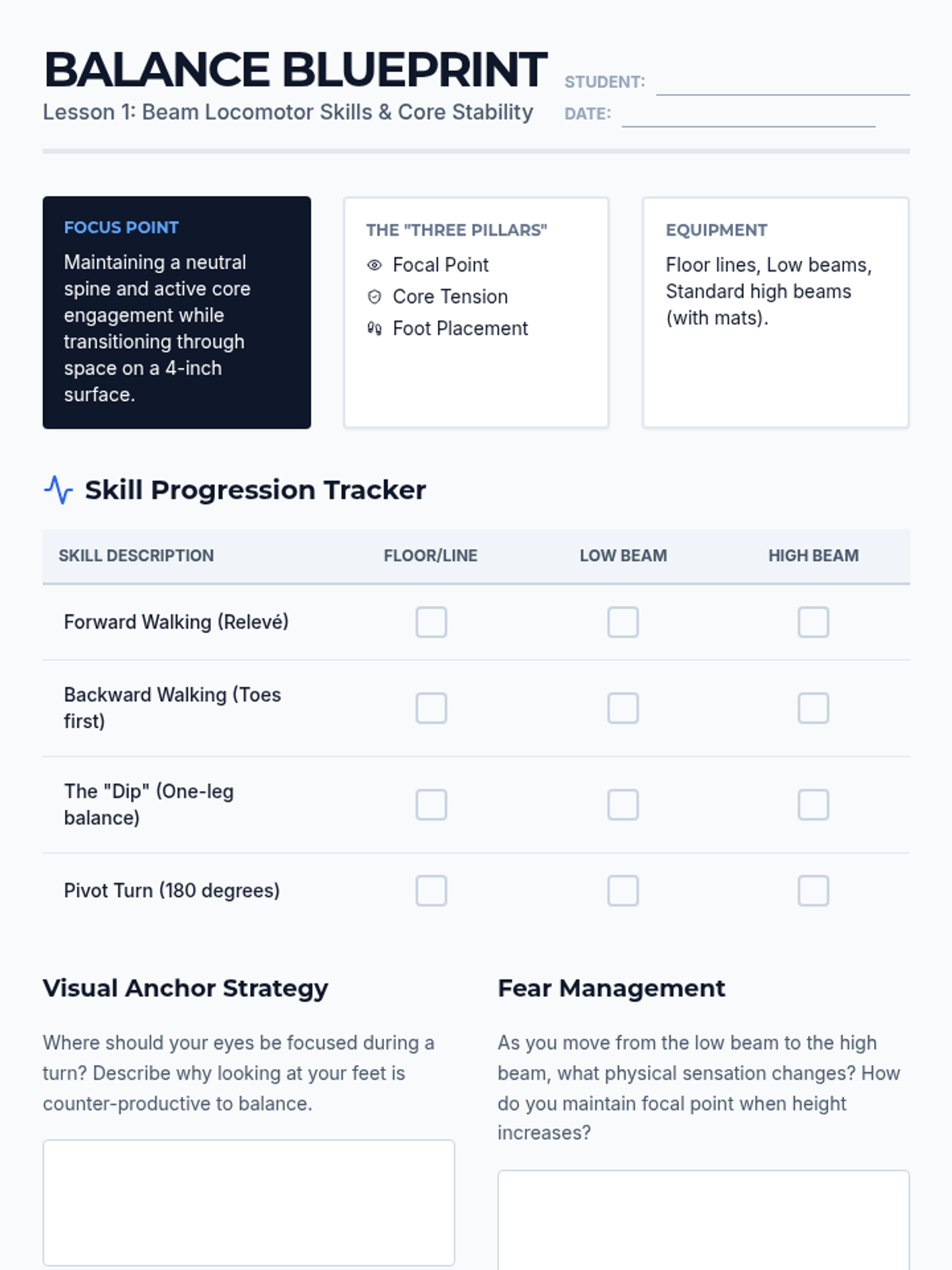 A comprehensive 11th-grade gymnastics sequence focusing on balance beam precision and vaulting power. Students develop technical skills, psychological resilience, and critical safety spotting techniques across five intensive lessons.