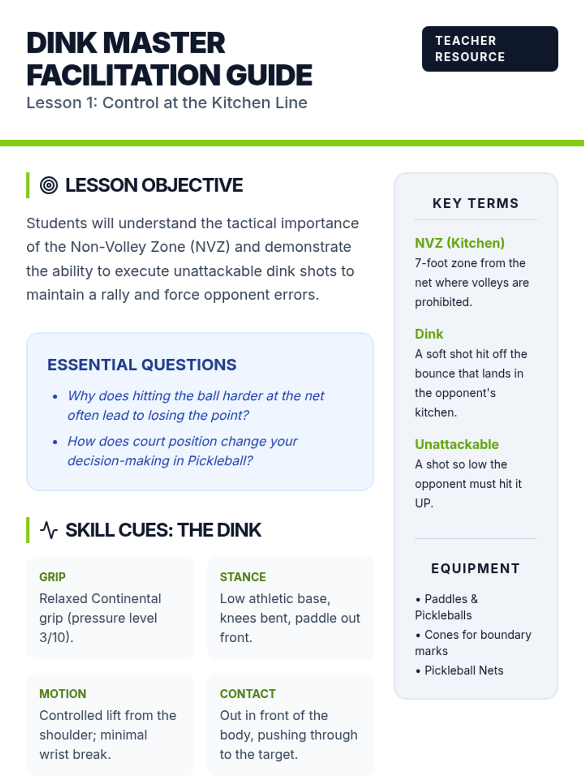 A comprehensive 8th-grade physical education unit focused on the tactical nuances of Pickleball. Students progress from fundamental kitchen control to complex match strategy and tournament play.