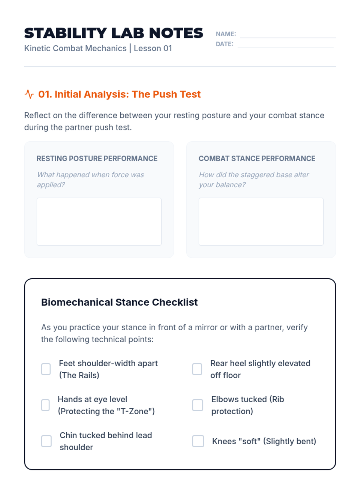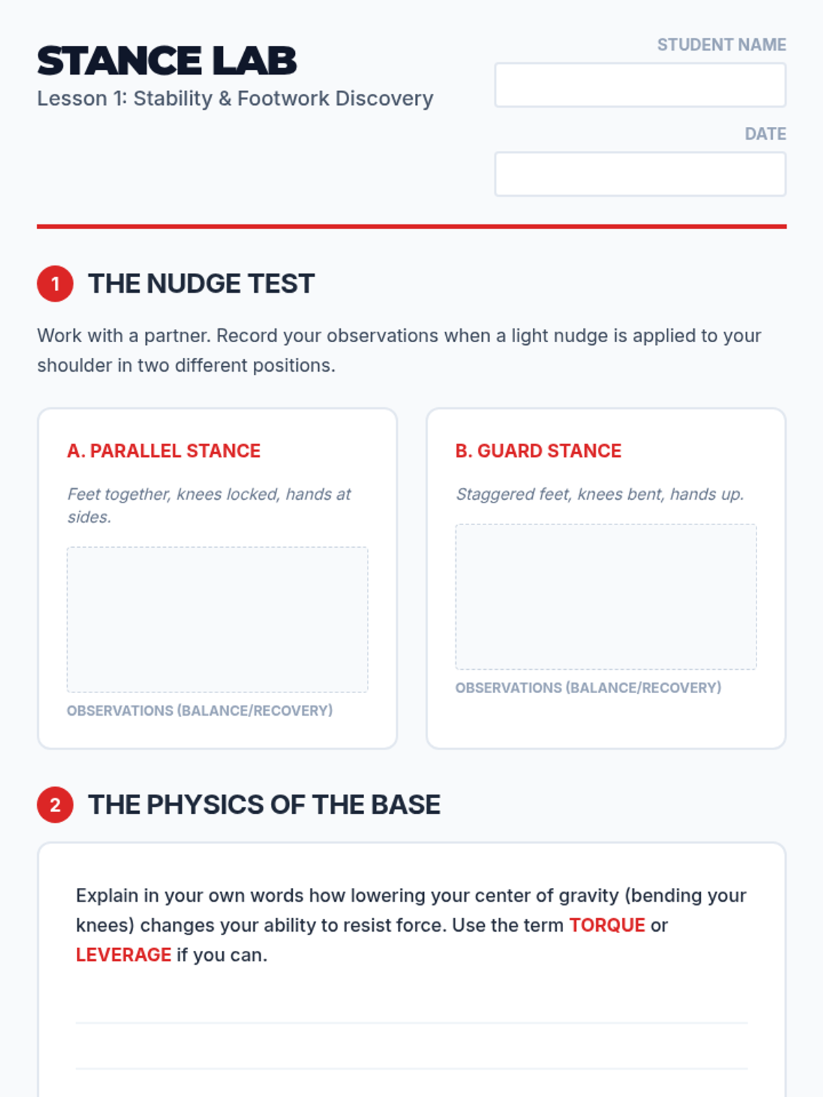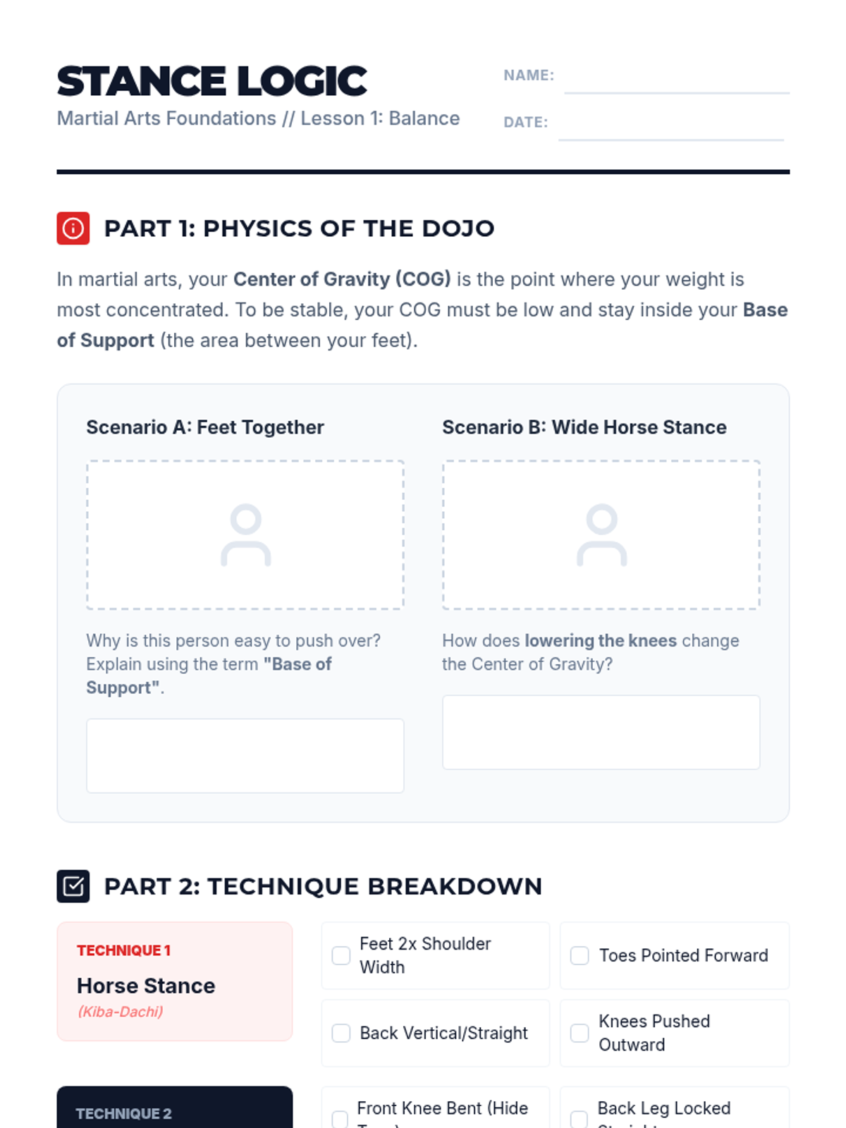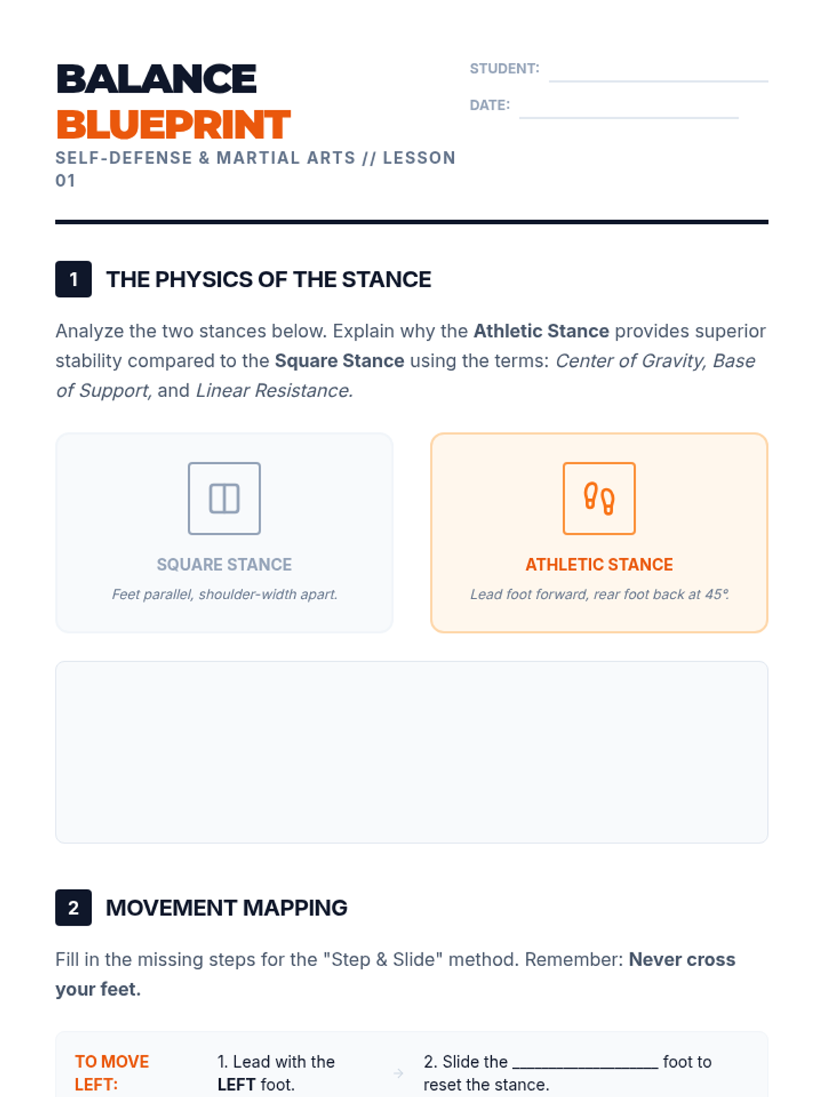 A comprehensive 12th-grade physical education unit focused on the biomechanics, physics, and practical application of striking and defensive techniques in martial arts and self-defense. Students progress from foundational balance to complex offensive and defensive combinations.
