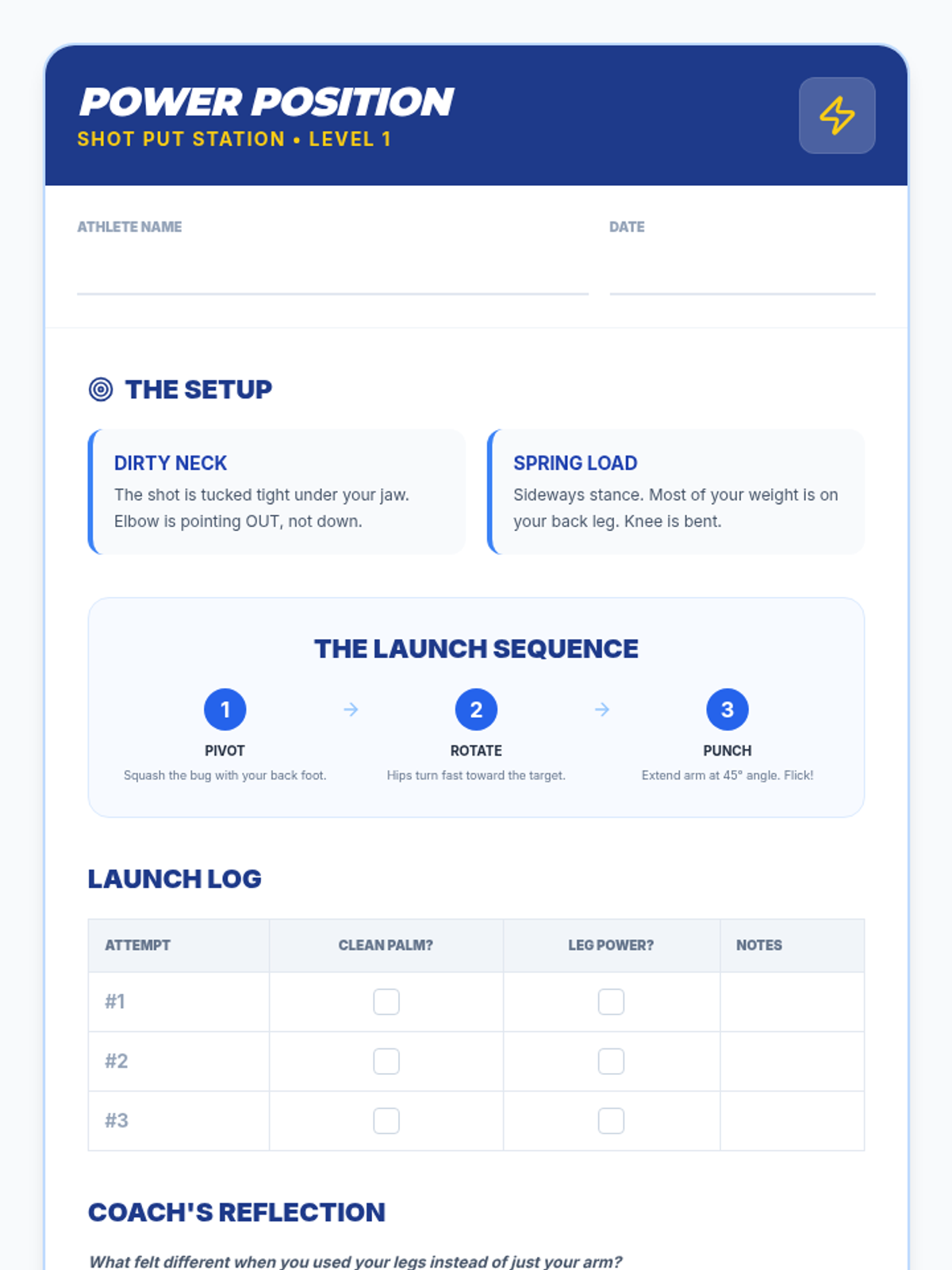This sequence introduces 5th-grade students to the mechanics of shot put, discus, and javelin throwing. Students explore the physics of power generation through leg drive, rotation, and momentum while prioritizing safety in the throwing sector.