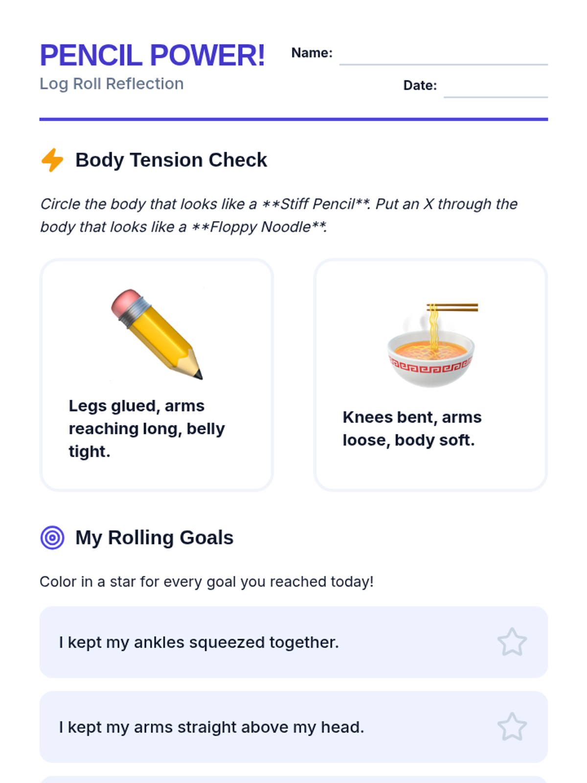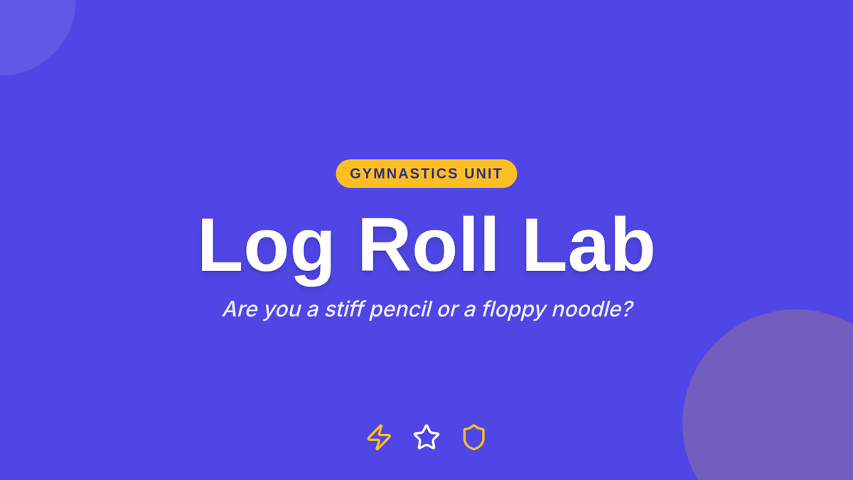 A foundational gymnastics sequence for 1st graders focusing on body tension, rolling mechanics, and static balances. Students progress from simple log rolls to forward rolls and learn to transition into stable balance poses.