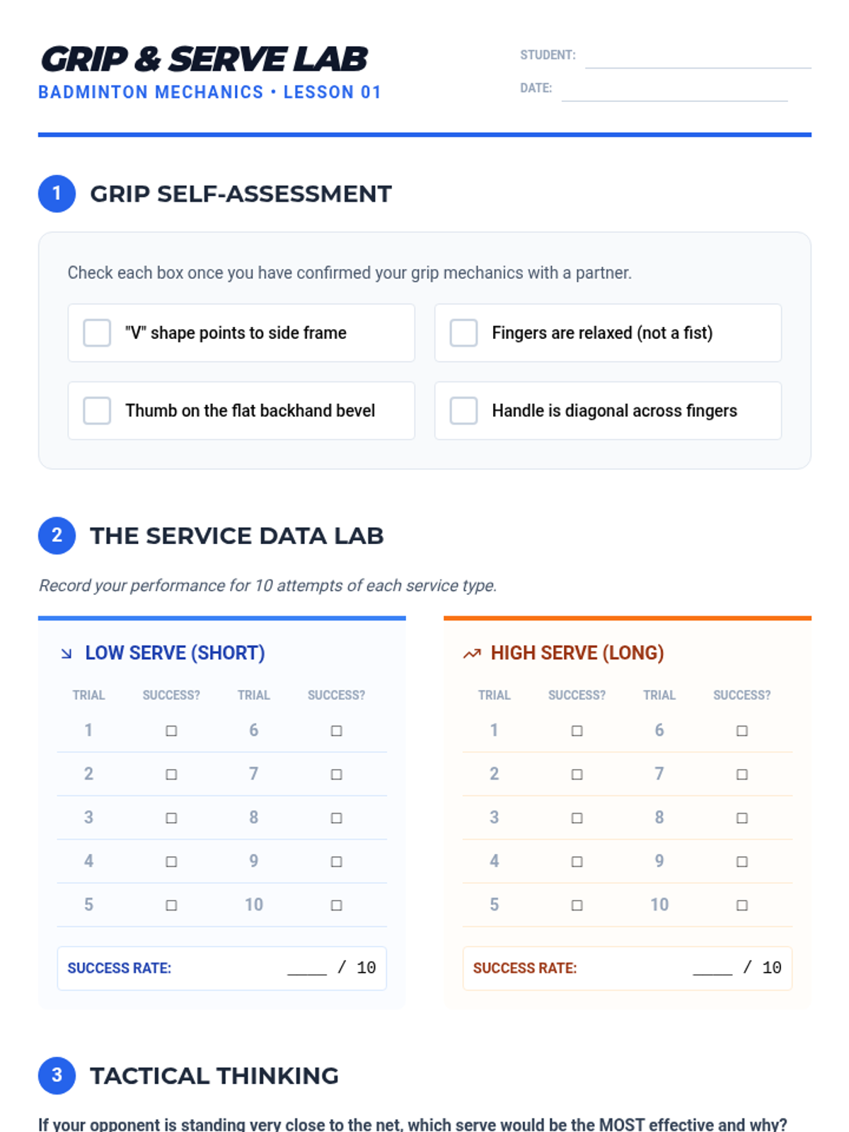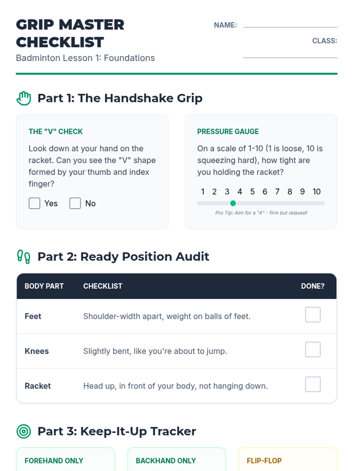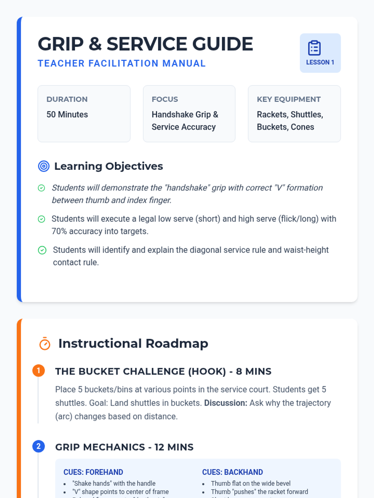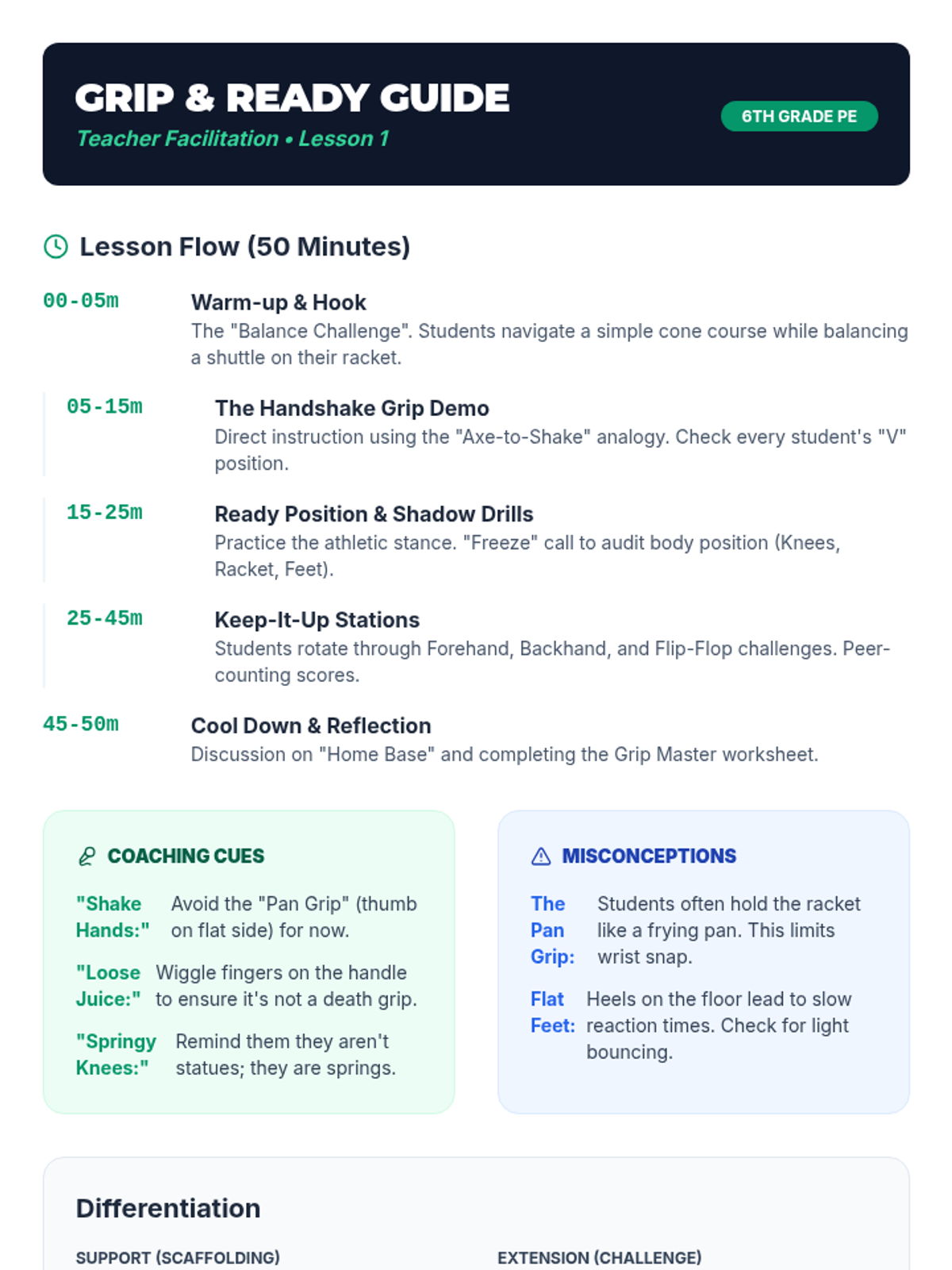 This sequence introduces 6th grade students to the foundational mechanics of badminton, focusing on grip, movement, and striking techniques. The learning arc progresses from static racket handling to dynamic movement patterns and competitive rallying.