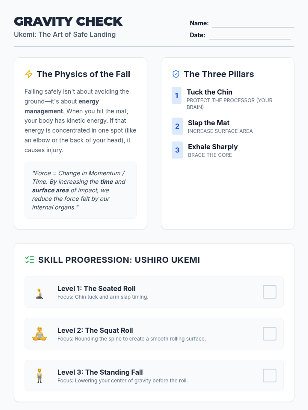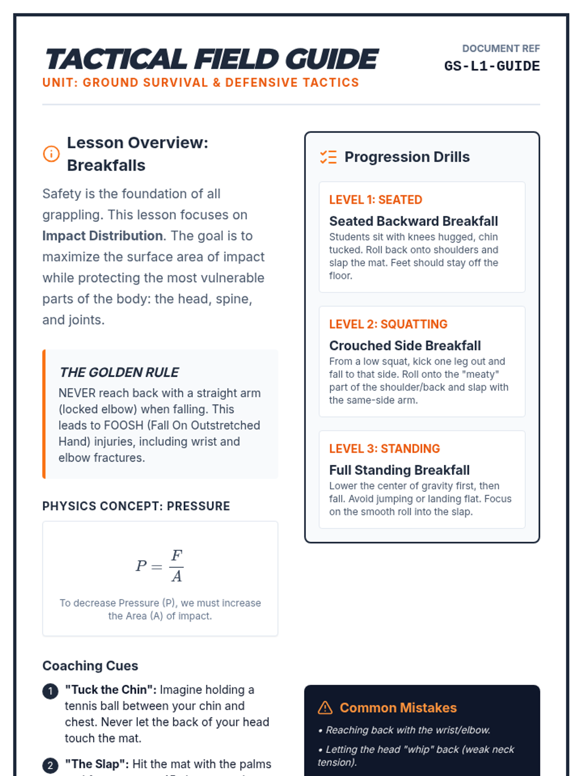 A comprehensive 11th-grade physical education unit focused on self-defense through grappling, leverage, and mechanical advantage. Students learn injury prevention through safe falling, escapes from common holds, and ground survival strategies inspired by Judo and Brazilian Jiu-Jitsu.