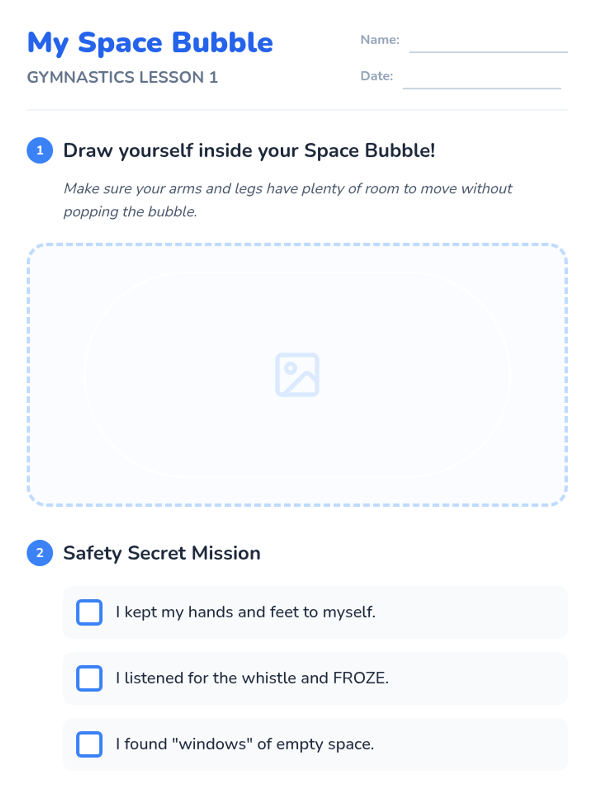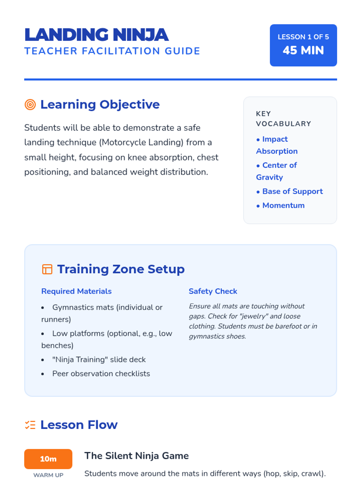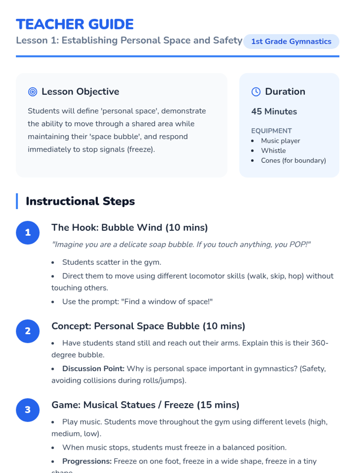 An introductory gymnastics sequence for 1st Grade focusing on body management, spatial awareness, and safe landing techniques. Students progress from establishing personal space to performing fundamental shapes and navigating obstacle courses.