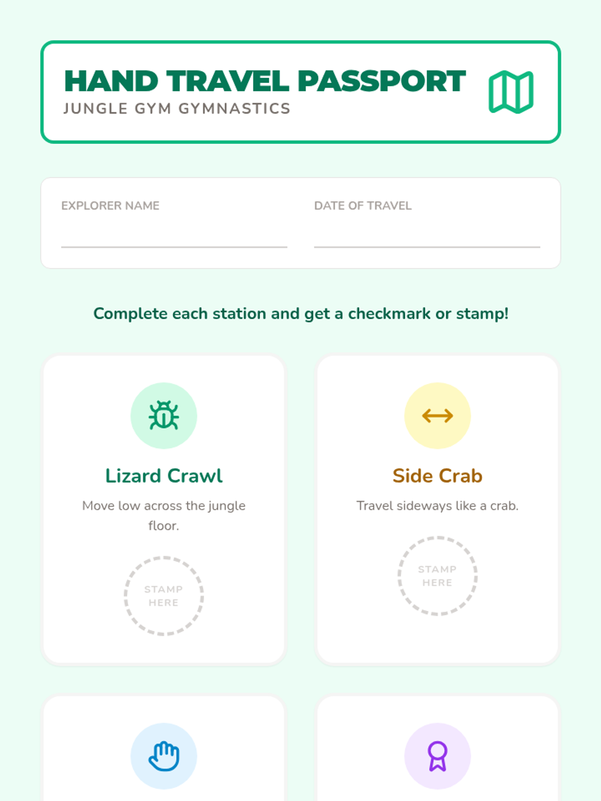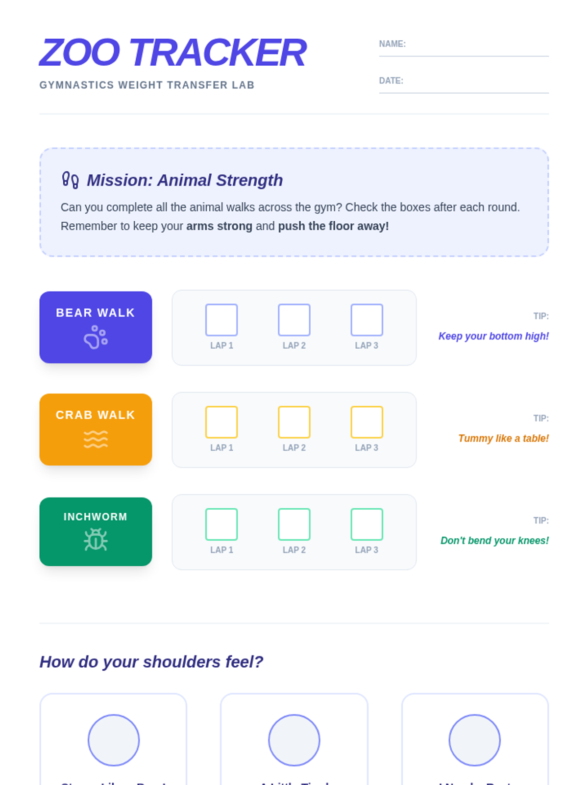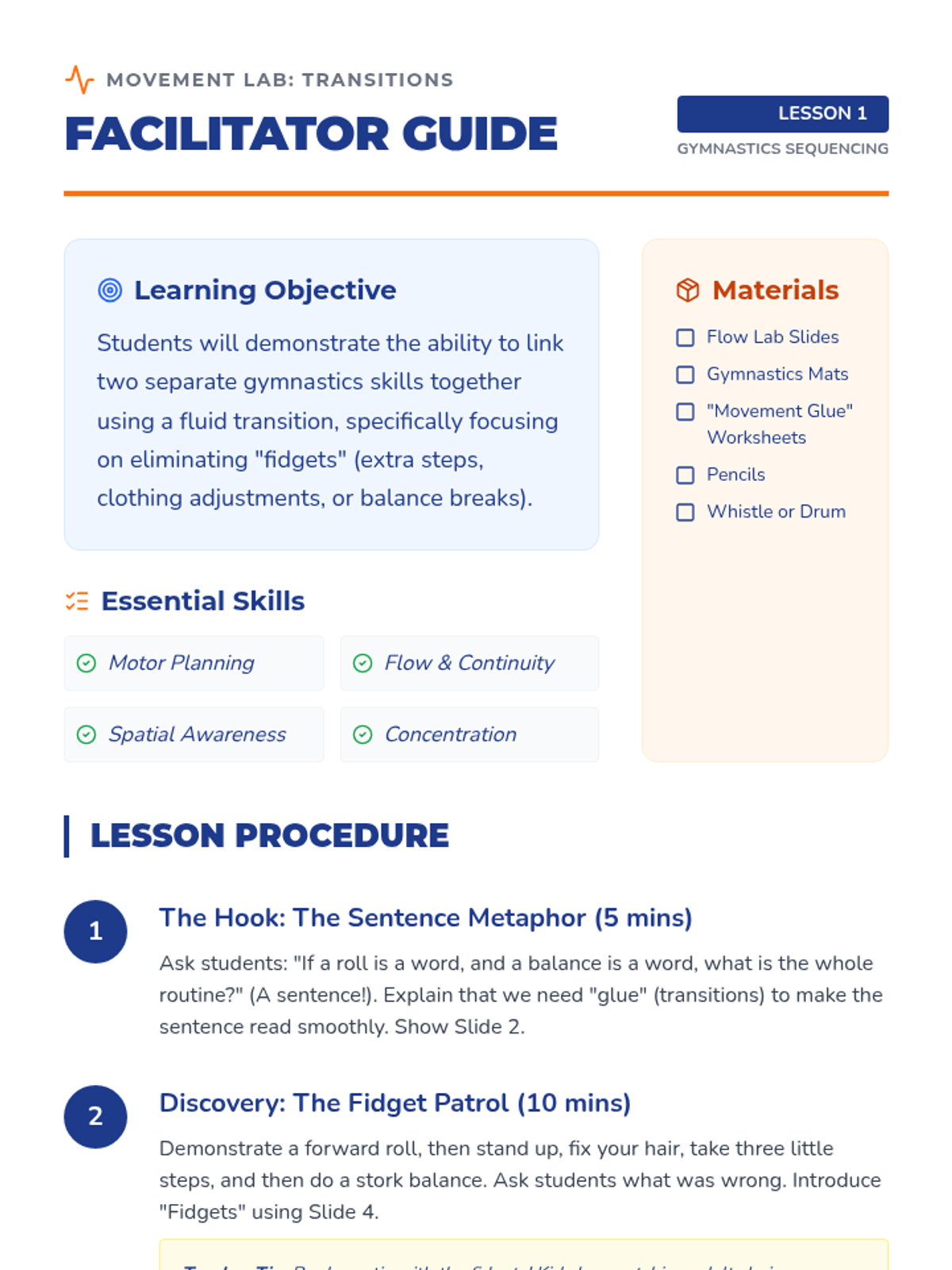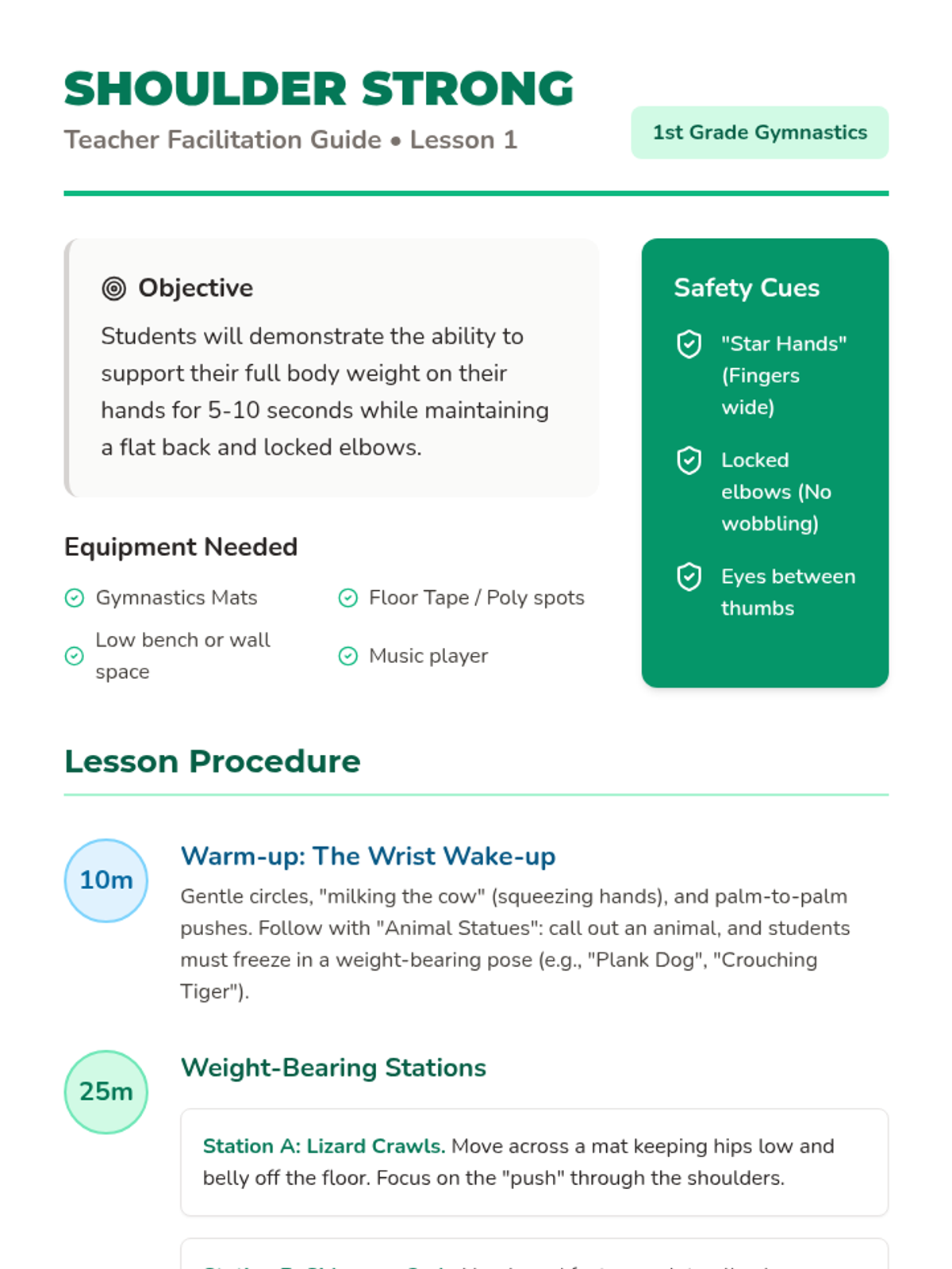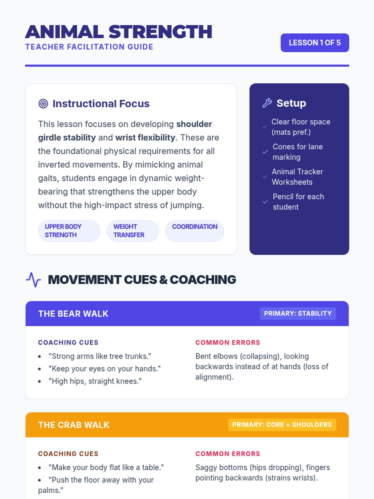 A 1st Grade gymnastics sequence focused on weight transfer, inversions, and introductory vaulting. Students build strength and confidence through animal-themed movements and stations.