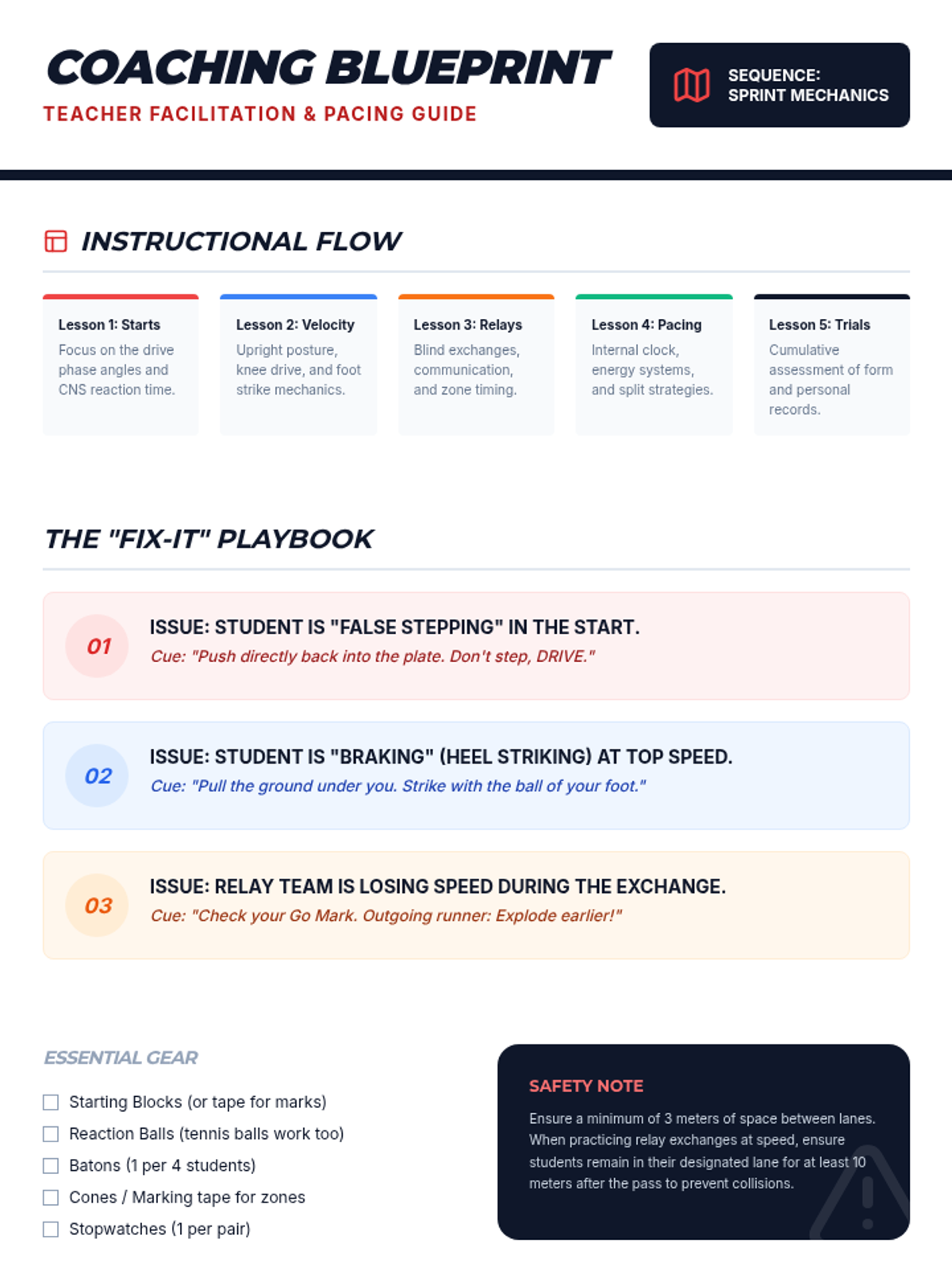 This 5-lesson sequence for 6th grade PE focuses on the biomechanics of sprinting, pacing strategies for middle distance, relay coordination, and hurdle rhythm. Students progress from individual form to collaborative teamwork, culminating in performance analysis and goal setting.