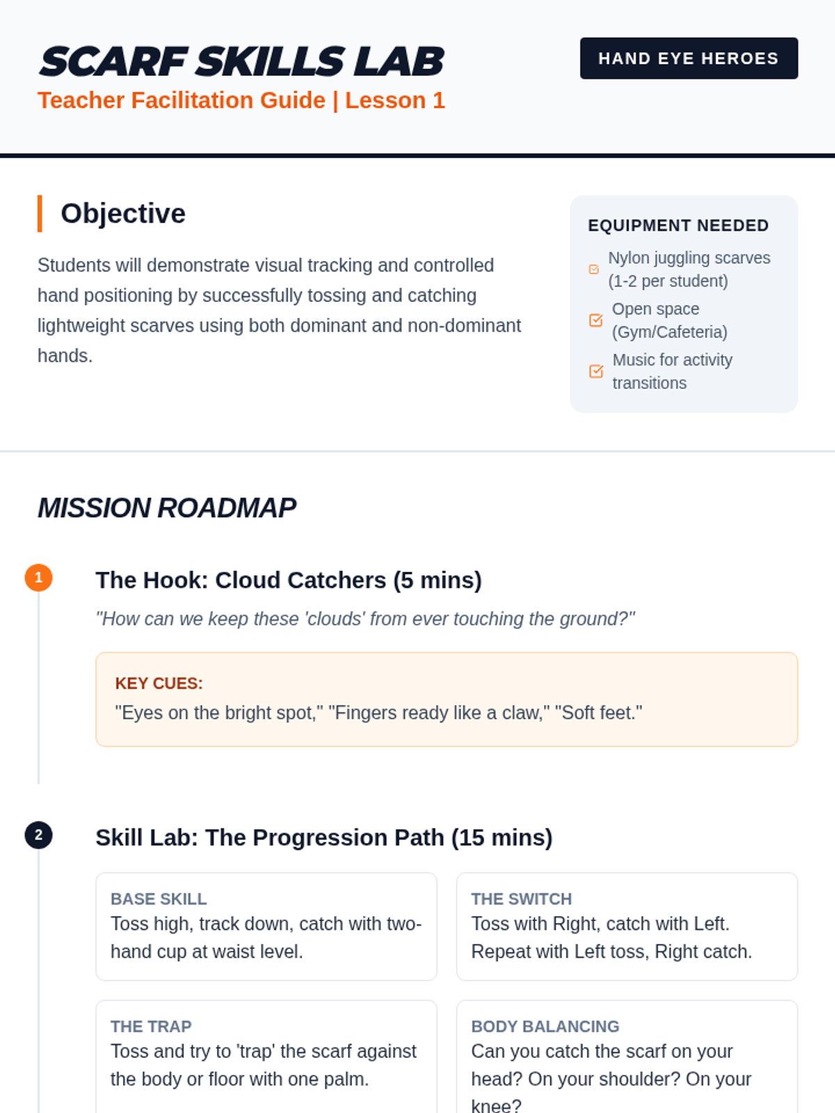 A mastery-based physical education sequence for 2nd grade focusing on fine motor object control. Students progress from tracking slow-moving scarves to mastering small object catching and implement striking, emphasizing the connection between visual tracking and hand positioning.