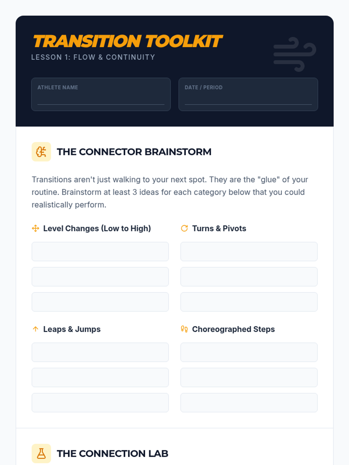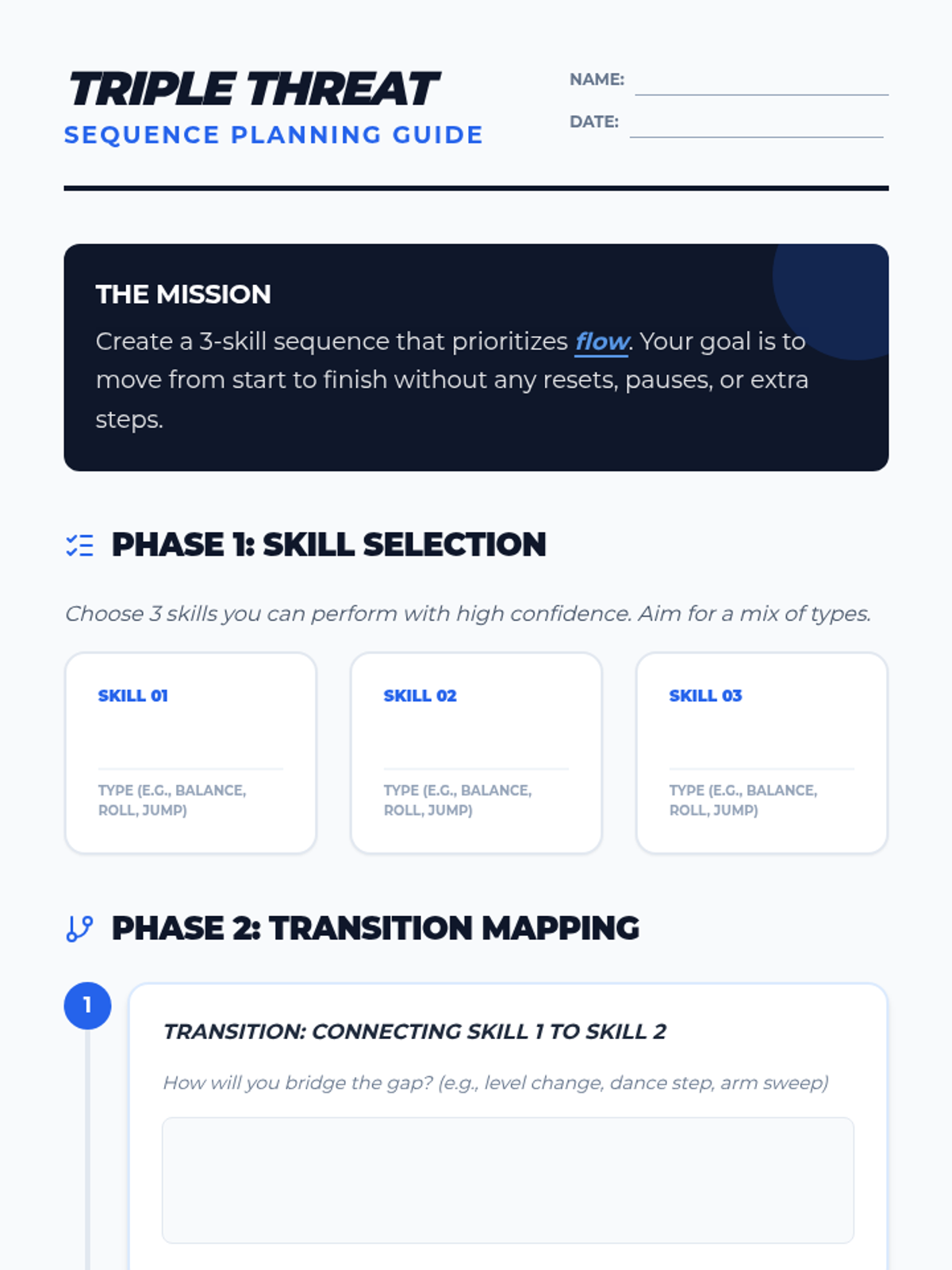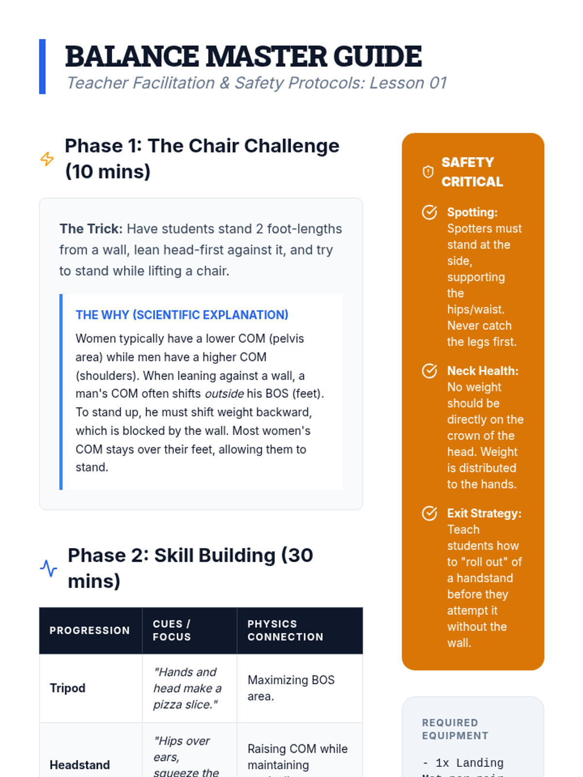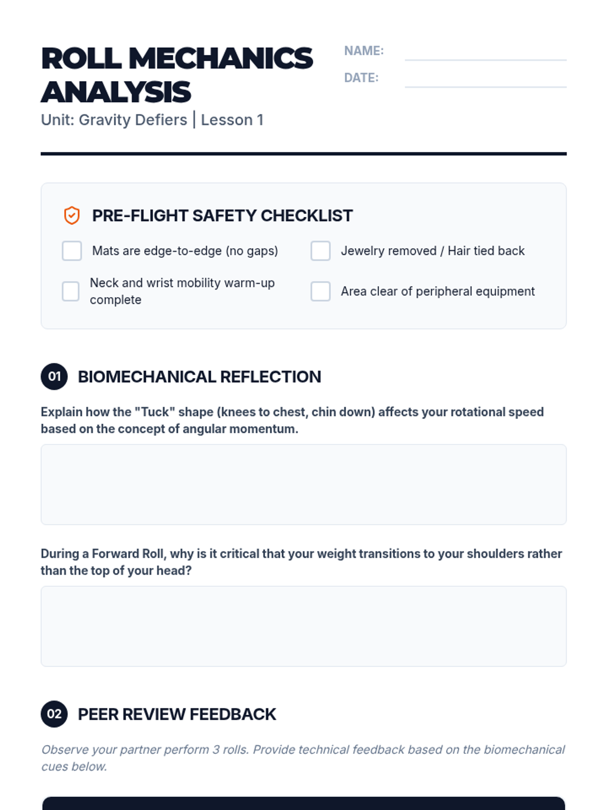 This sequence integrates physics concepts with fundamental floor skills to help students understand the mechanics of tumbling. Students explore center of mass, rotational mechanics, leverage, and force absorption through hands-on practice and video analysis.