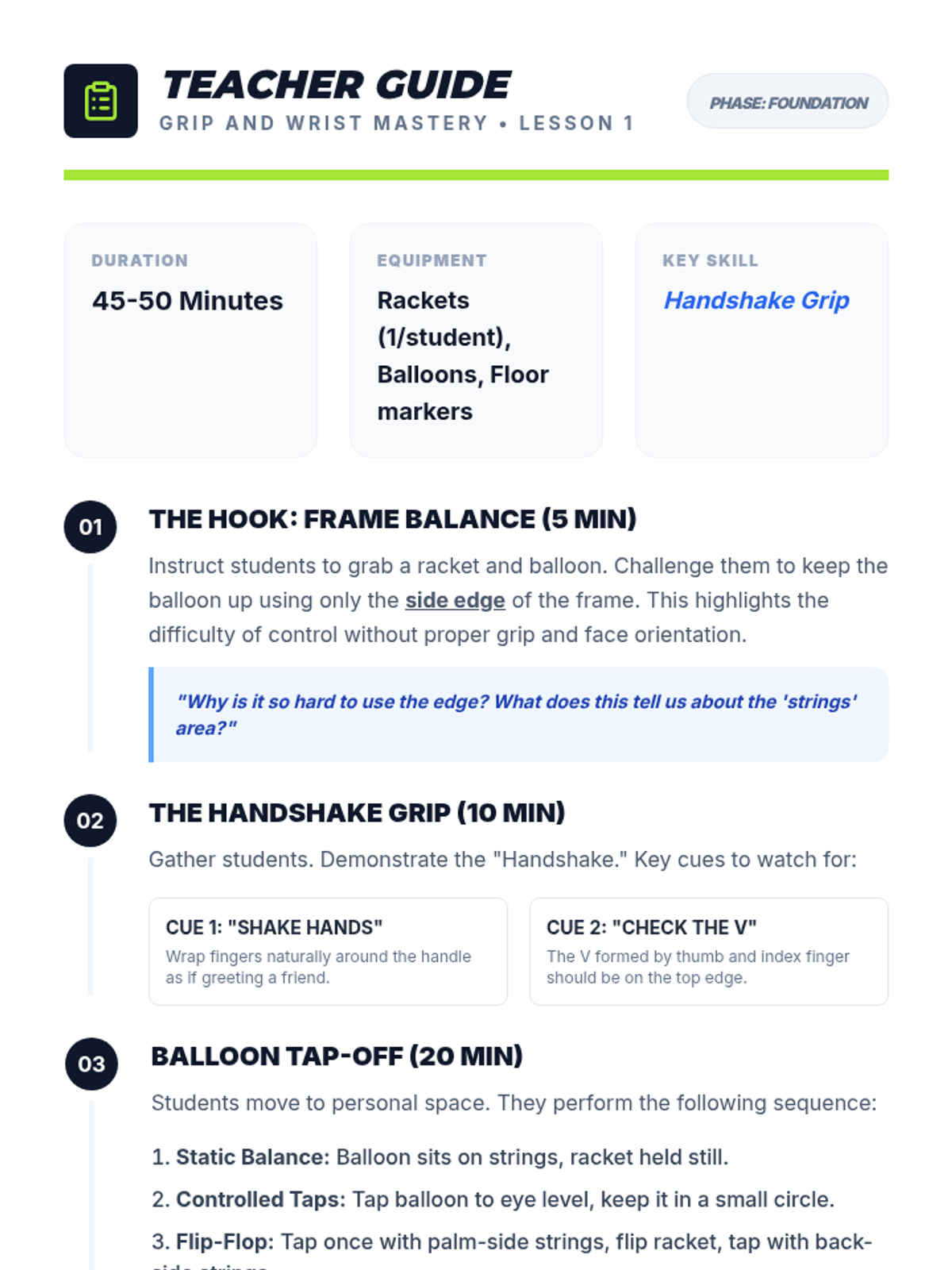 This sequence introduces 4th grade students to the essential physical foundations of racket sports, focusing on grip, wrist control, and arm mechanics. It progresses from basic handling with balloons to dynamic forehand and backhand strikes, culminating in serving and rallying.