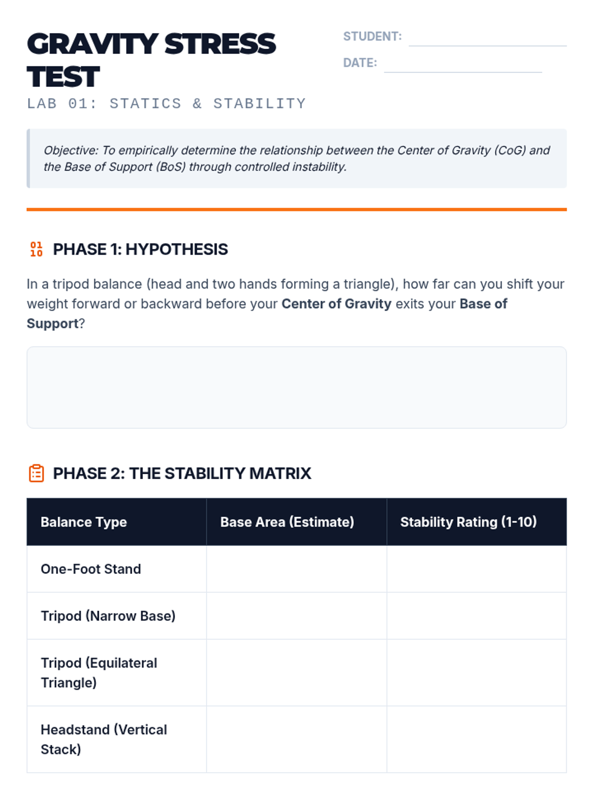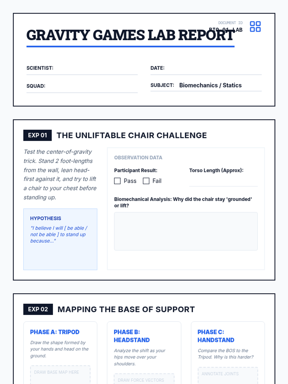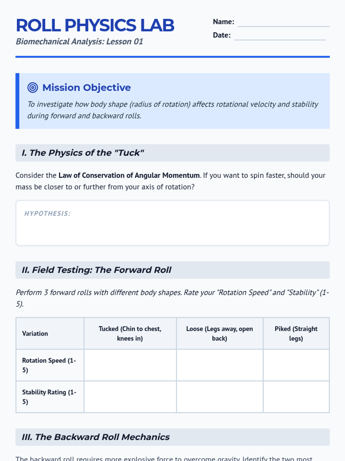 This sequence explores the physics of gymnastics, focusing on biomechanical principles like center of gravity, rotational inertia, and momentum transfer to improve tumbling performance. Students transition from static balance to dynamic rotation, culminating in a frame-by-frame video analysis of their own movement.