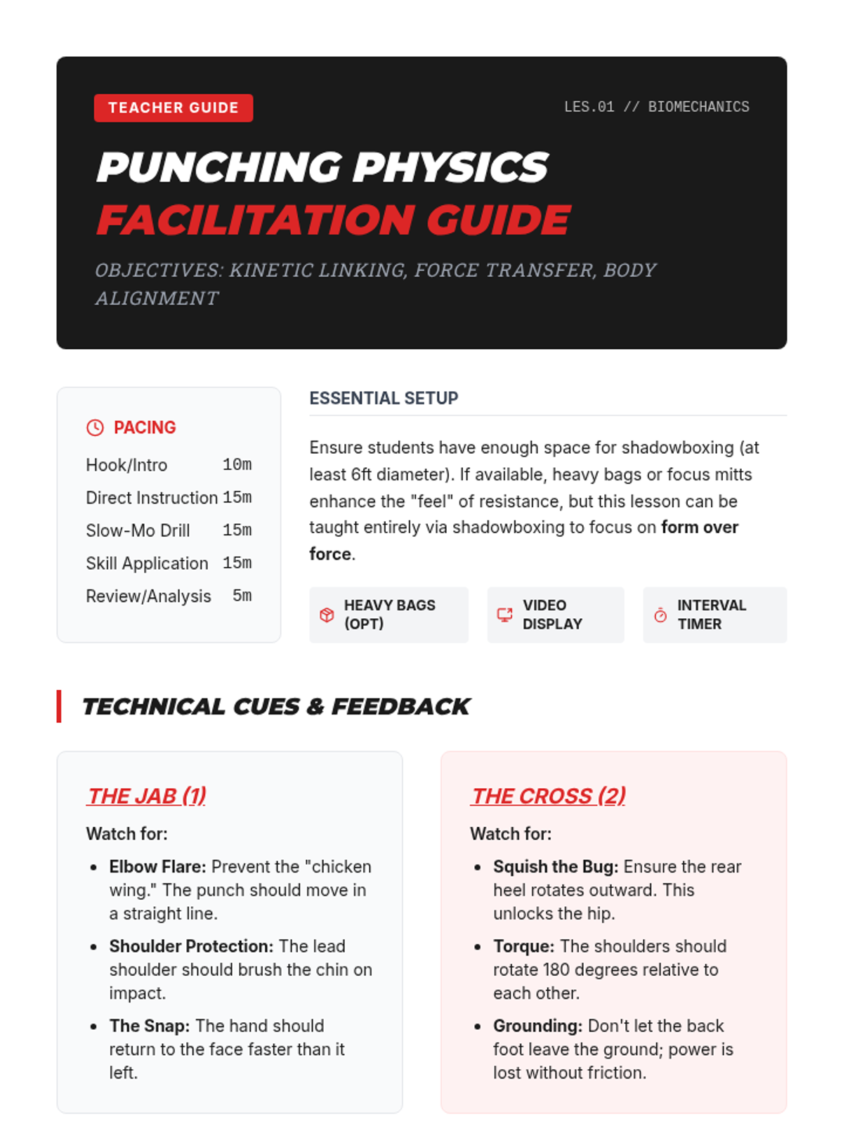 A biomechanics-focused martial arts sequence for 11th graders, exploring the kinetic chain, striking mechanics, and cardiovascular conditioning. Students progress from foundational straight punches to complex combinations and defensive maneuvers, culminating in a technical performance showcase.