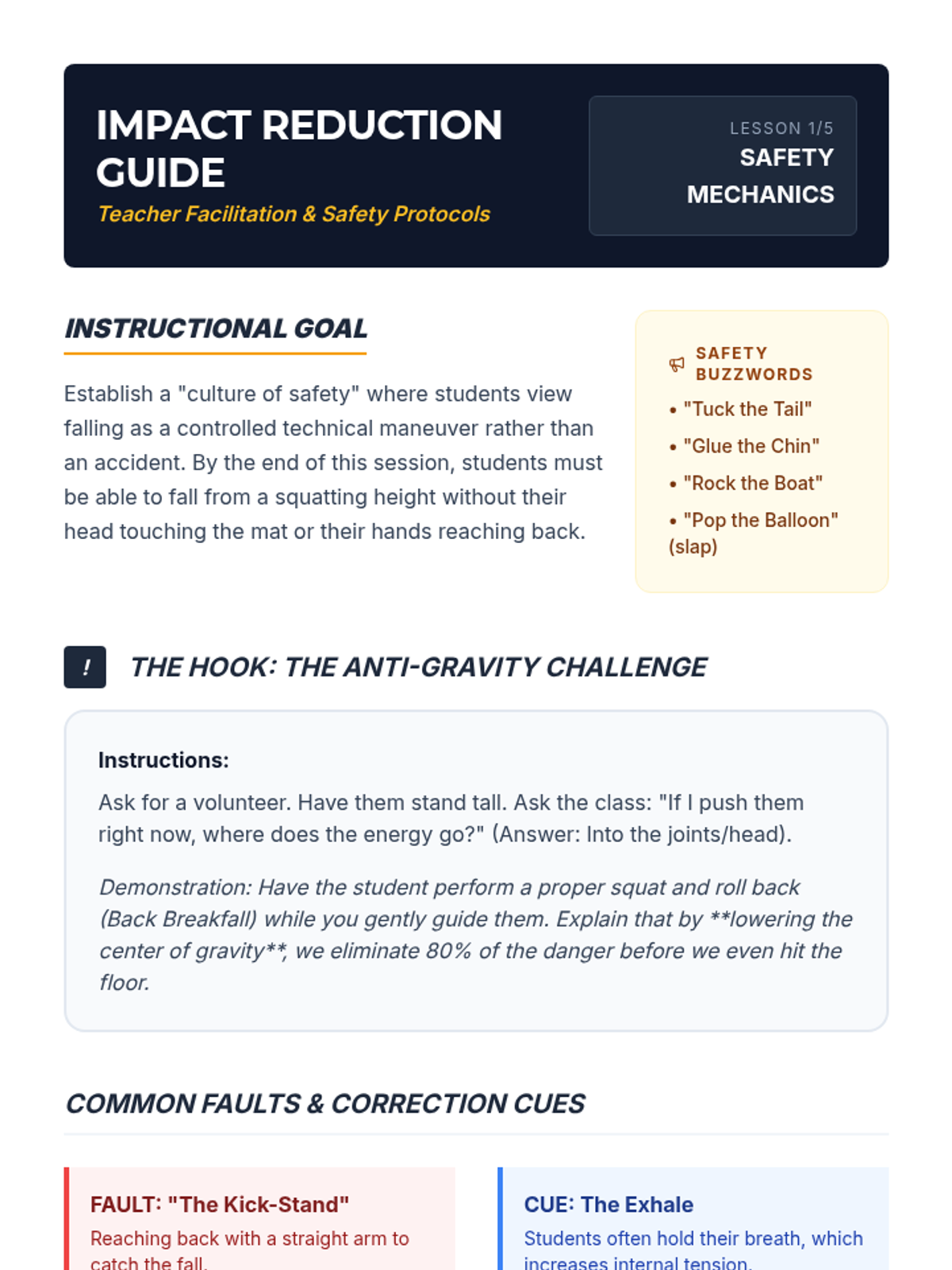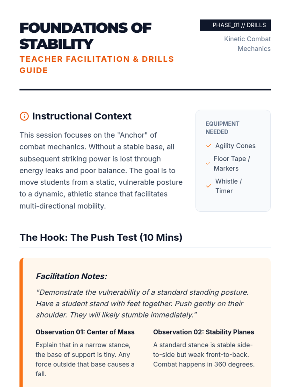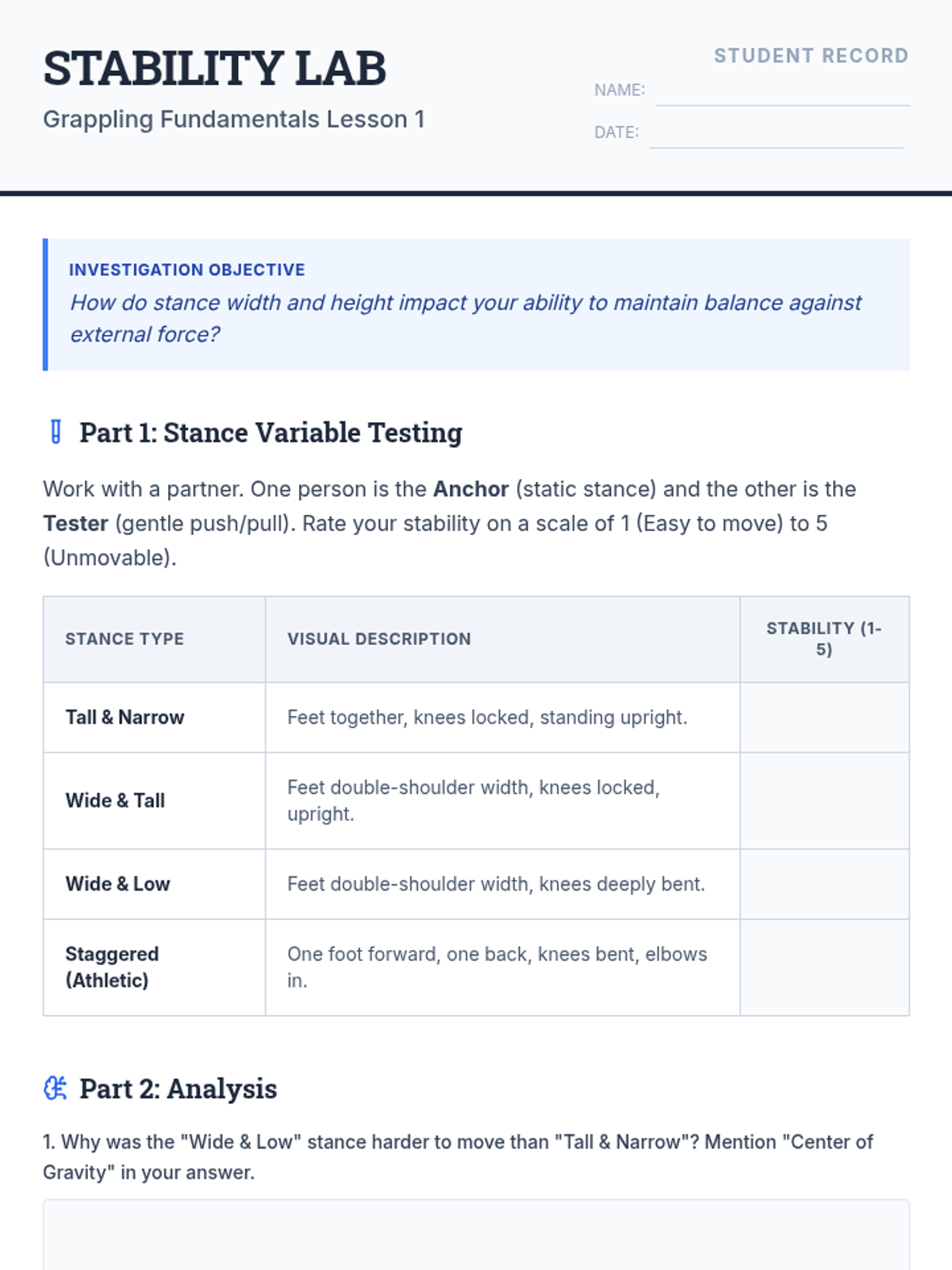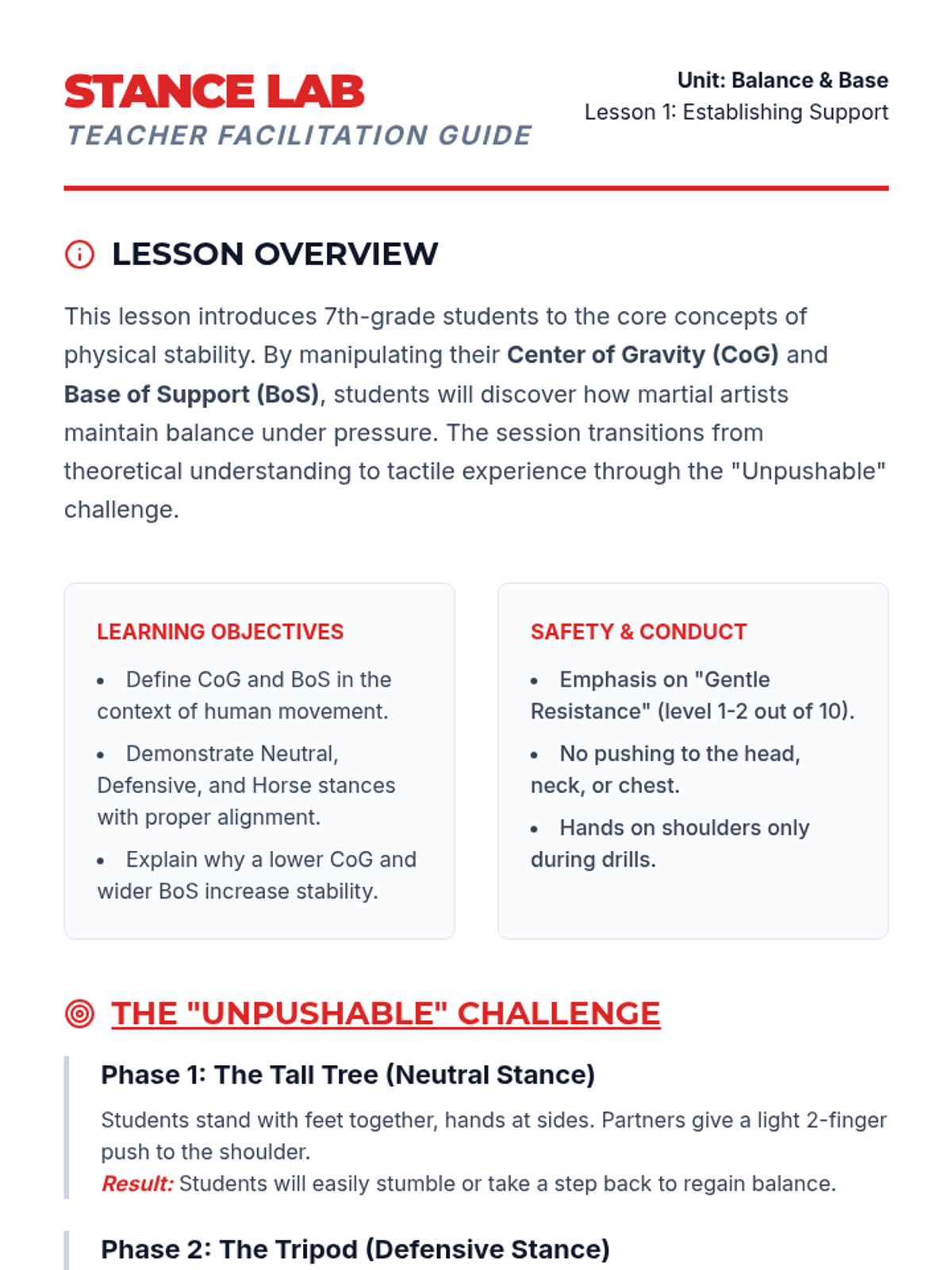 A foundational unit for 7th-grade students focusing on the physical prerequisites of martial arts and self-defense: balance, stability, safe movement, and injury prevention through breakfalls. Students explore how controlling their center of gravity and core can enhance their physical safety and stability.