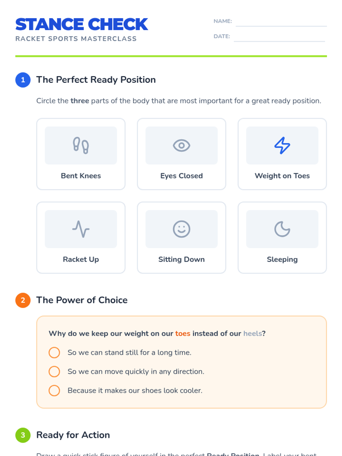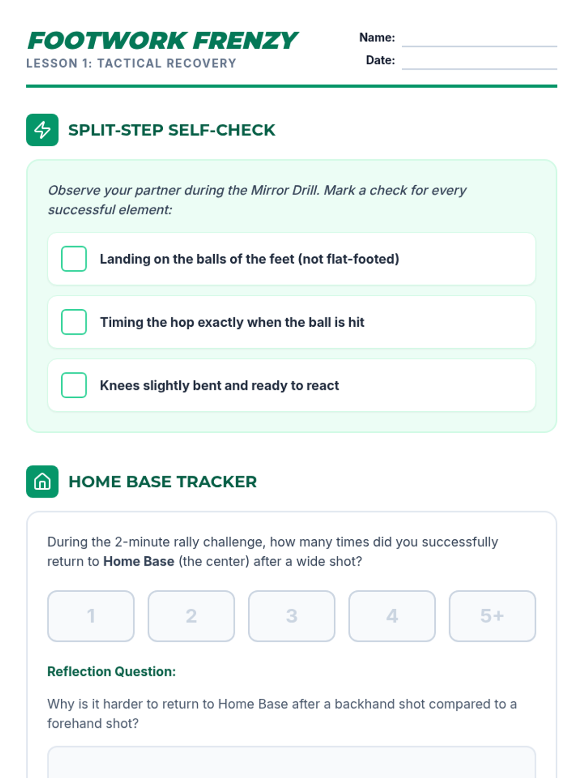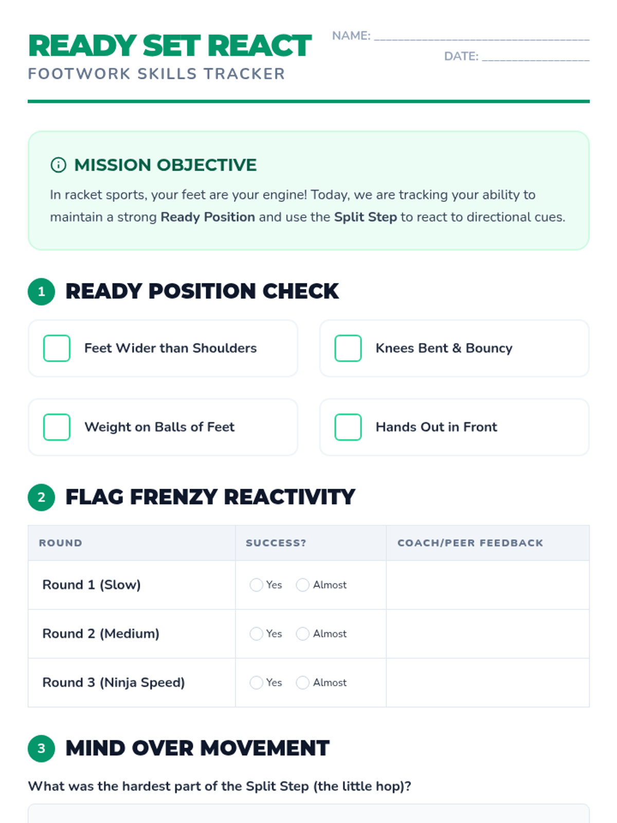 A comprehensive 3rd-grade unit on racket sports footwork, focusing on the athletic ready position, lateral shuffle steps, tactical court recovery, and judging ball trajectory. Students progress from basic reactivity to complex court coverage patterns through game-based learning and movement simulations.