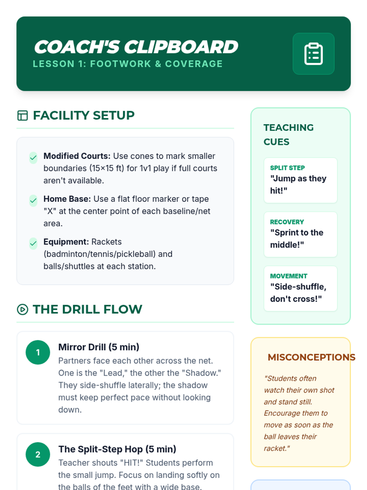 This sequence moves students from static skill practice to dynamic game situations, emphasizing court movement and tactical decision-making in racket sports. Students explore concepts of open space, defensive recovery, and offensive placement within a modified court boundary.