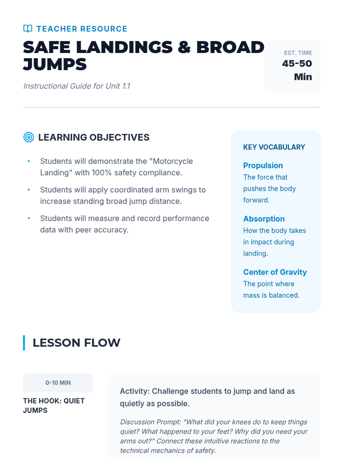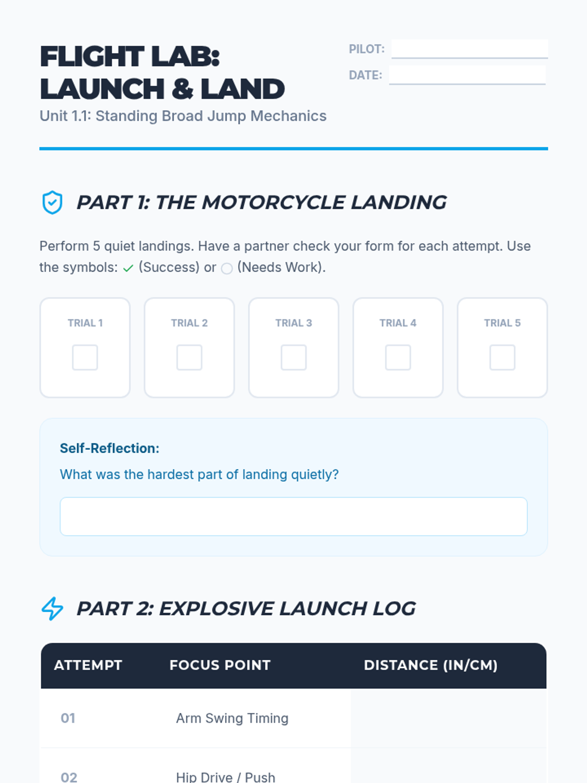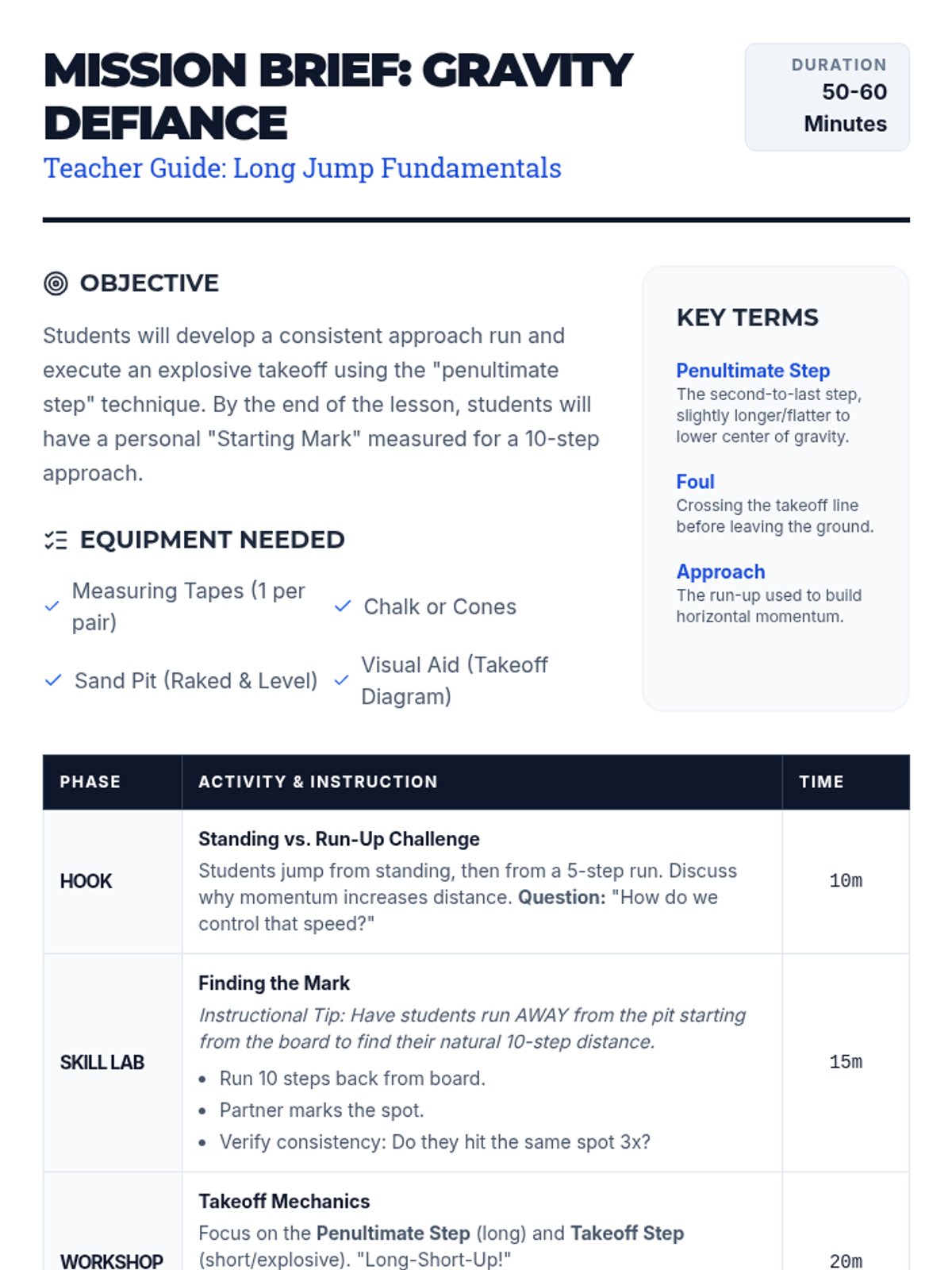 A comprehensive 5th Grade physical education unit focused on the mechanics, safety, and competition of horizontal jumping events. Students progress from safe landing techniques to the complex coordination of the long jump and triple jump, concluding with a student-led competition.