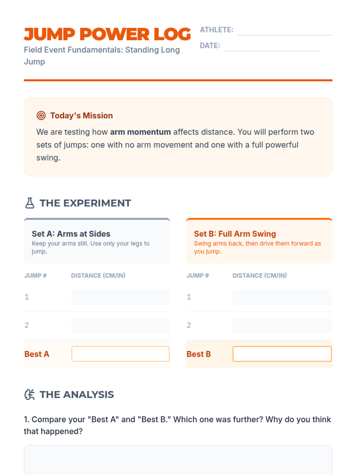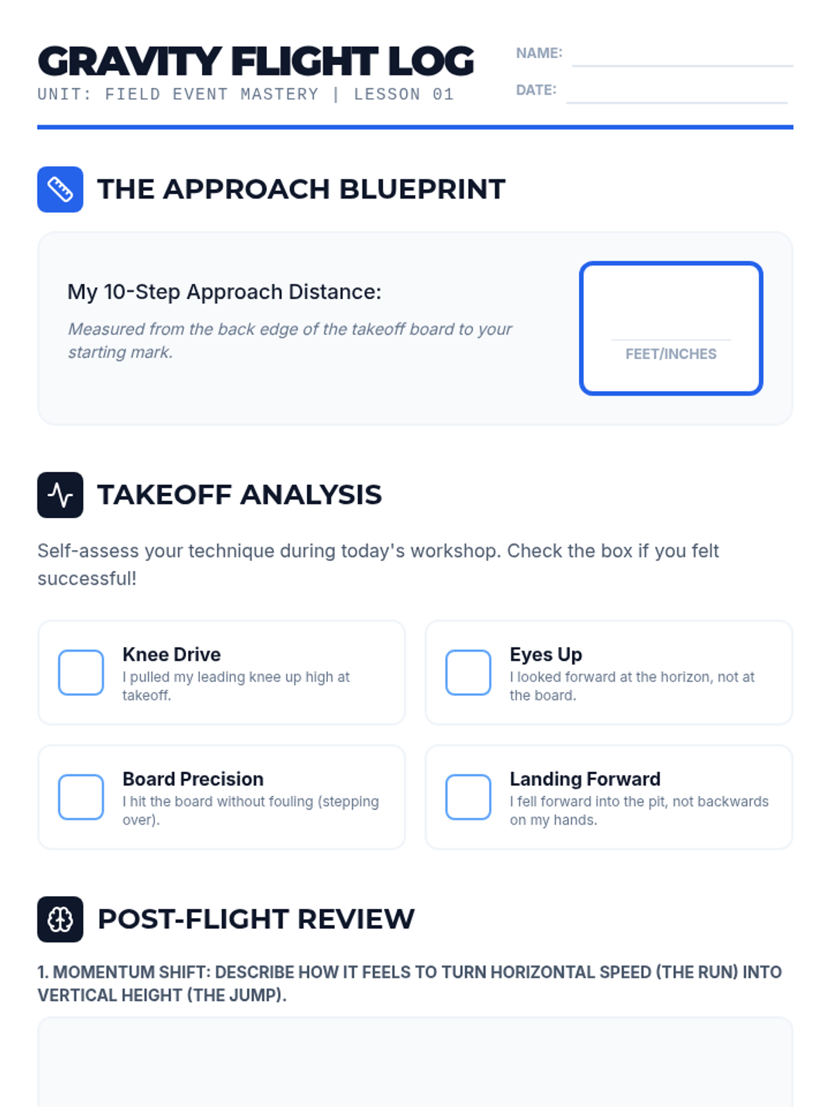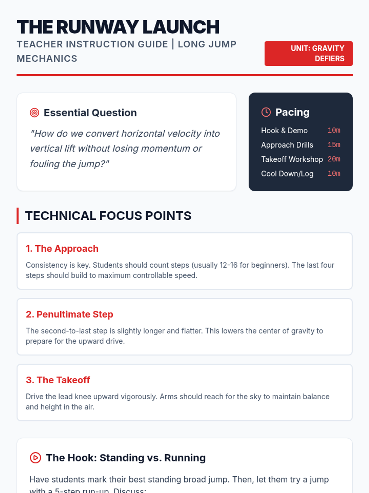 A comprehensive 5th Grade physical education unit focused on the mechanics, safety, and competition of horizontal jumping events. Students progress from safe landing techniques to the complex coordination of the long jump and triple jump, concluding with a student-led competition.