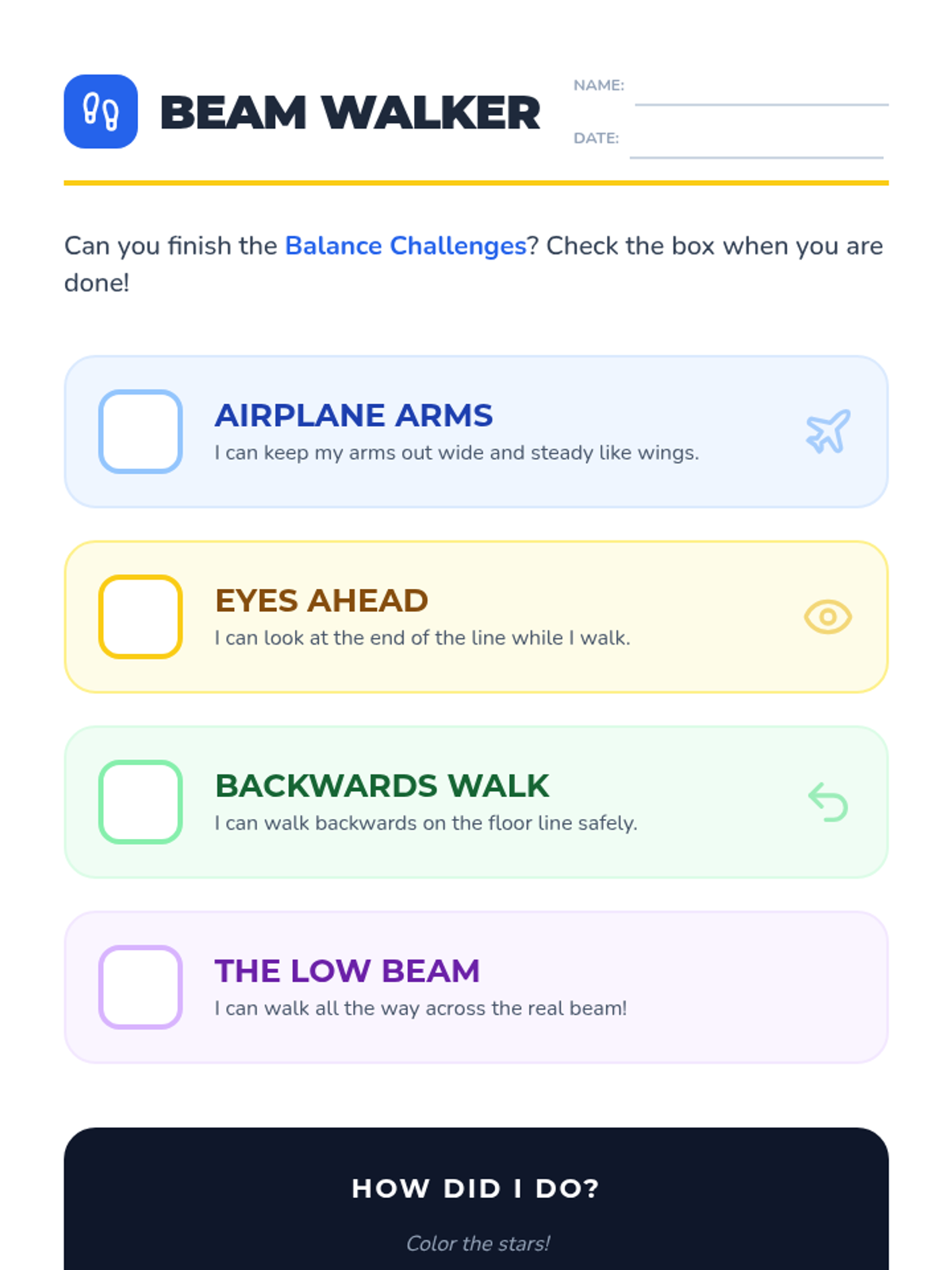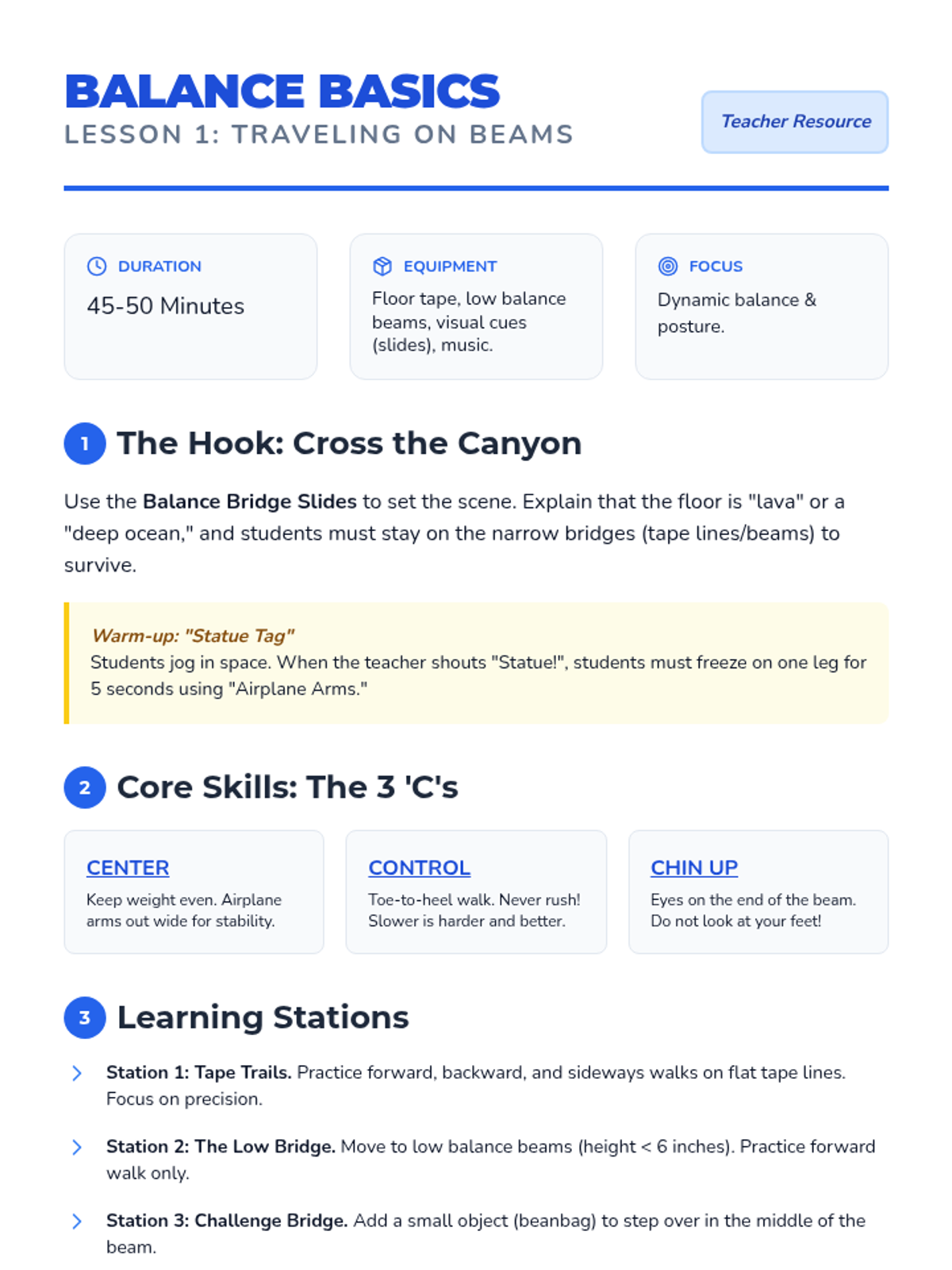 A 2nd-grade gymnastics sequence focused on developing stability, core strength, and confidence on elevated surfaces or narrow lines. Students explore static balances, dynamic travel, level changes, and safe dismounts through inquiry-based and skill-building activities.