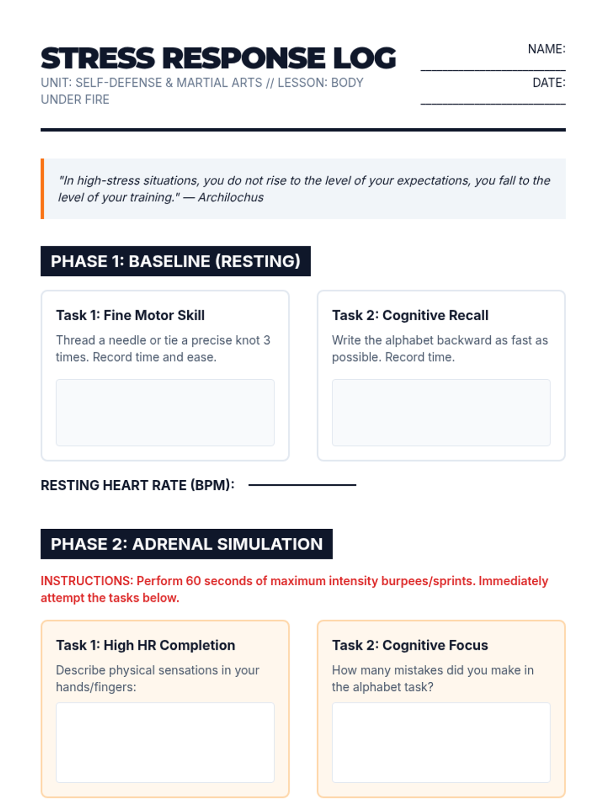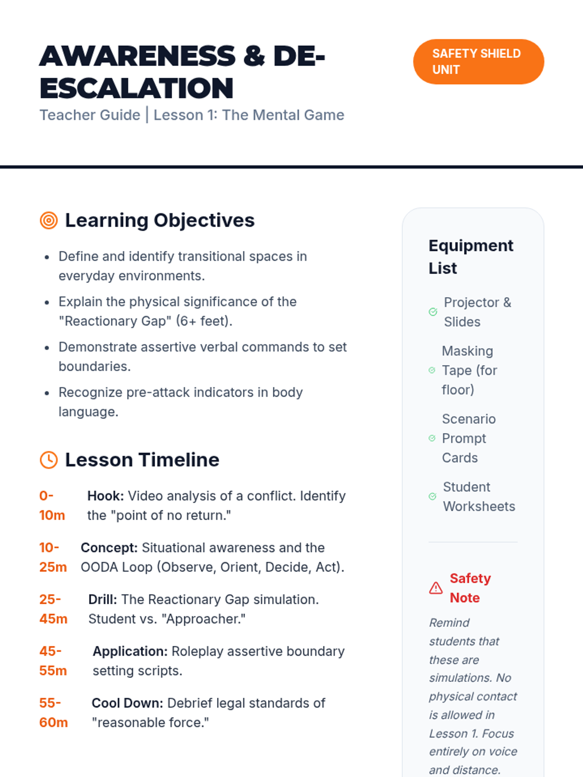 This sequence introduces 9th-grade students to personal safety, covering situational awareness, verbal de-escalation, defensive stances, striking mechanics, and escape techniques. It culminates in stress-based simulations to test decision-making and physical skills in a controlled environment.