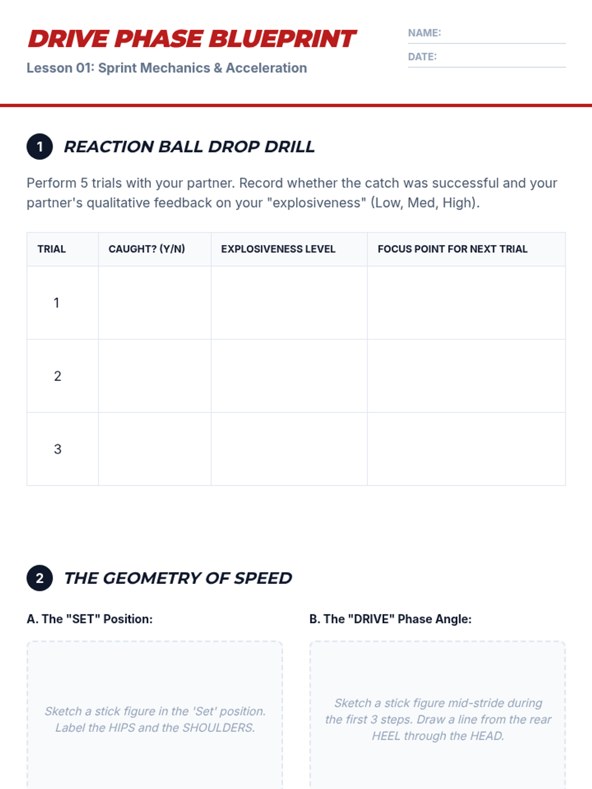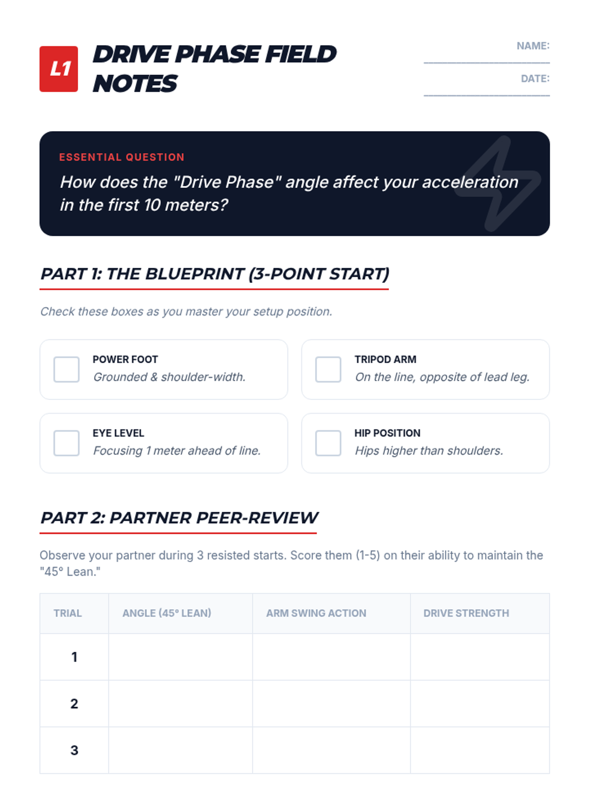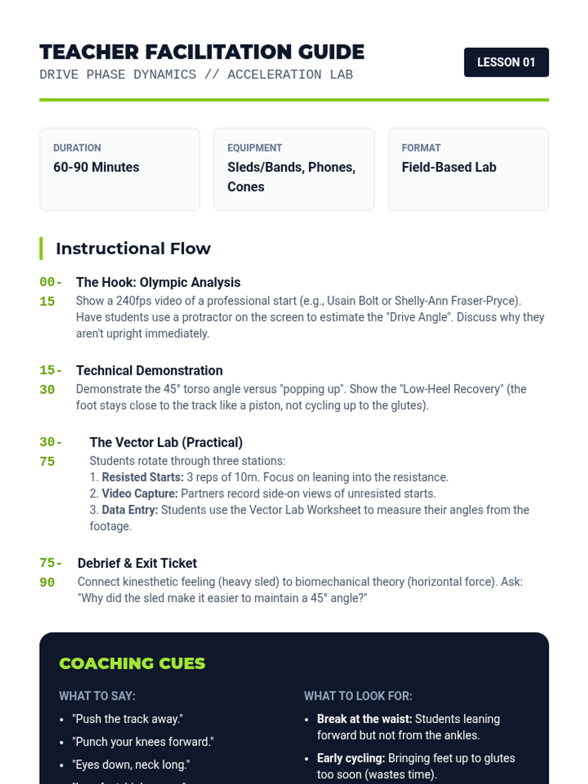 A high-performance track and field unit for 12th-grade students that integrates biomechanics and physiology. Students analyze acceleration physics, stride efficiency, energy systems, and relay coordination to optimize their athletic performance through data-driven training.