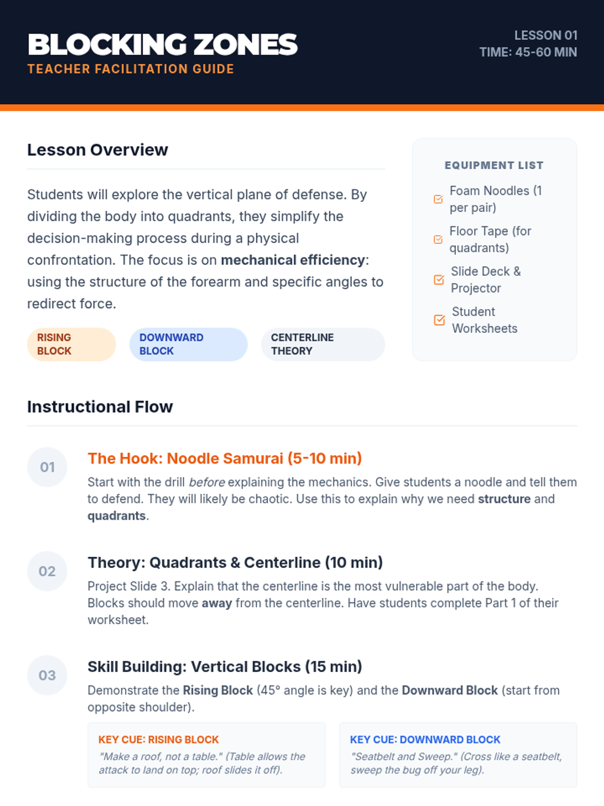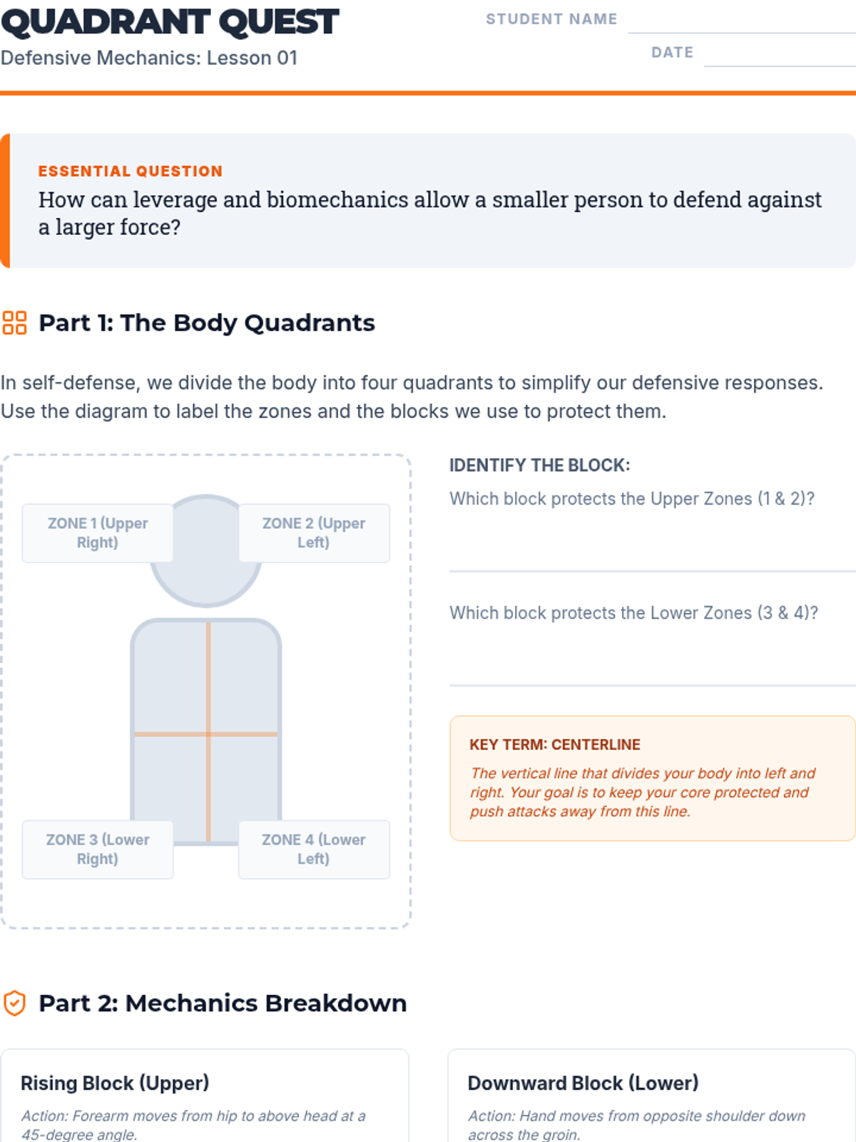 A comprehensive 8th-grade physical education sequence focusing on the biomechanics of martial arts striking and blocking. Students explore kinetic linking, balance, and precision through five progressive lessons.