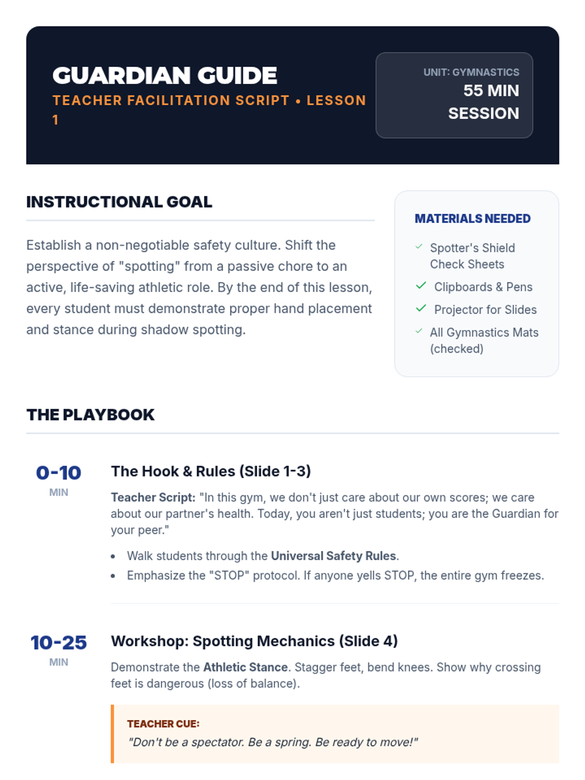 An advanced gymnastics sequence for 12th graders focusing on beam, vault, and the critical skill of spotting. Students transition from performers to 'safety coaches,' emphasizing risk management and technical proficiency.