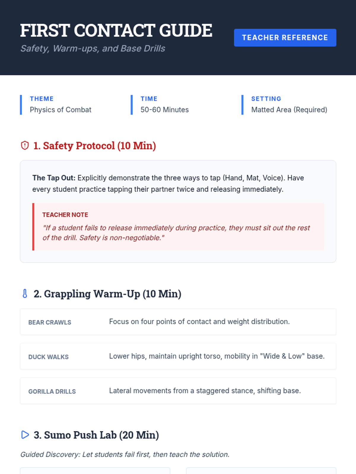 A comprehensive introduction to grappling for 8th graders, focusing on leverage, balance, and positional control. Students learn to use their center of gravity and mechanical advantage to manage physical encounters safely and effectively.