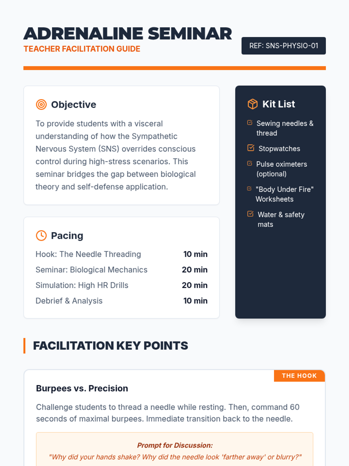 An advanced self-defense sequence for undergraduate students focusing on the physiological and psychological aspects of high-stress combat. Students explore how adrenaline affects decision-making and motor skills through simulations, low-light training, and multiple-attacker scenarios.