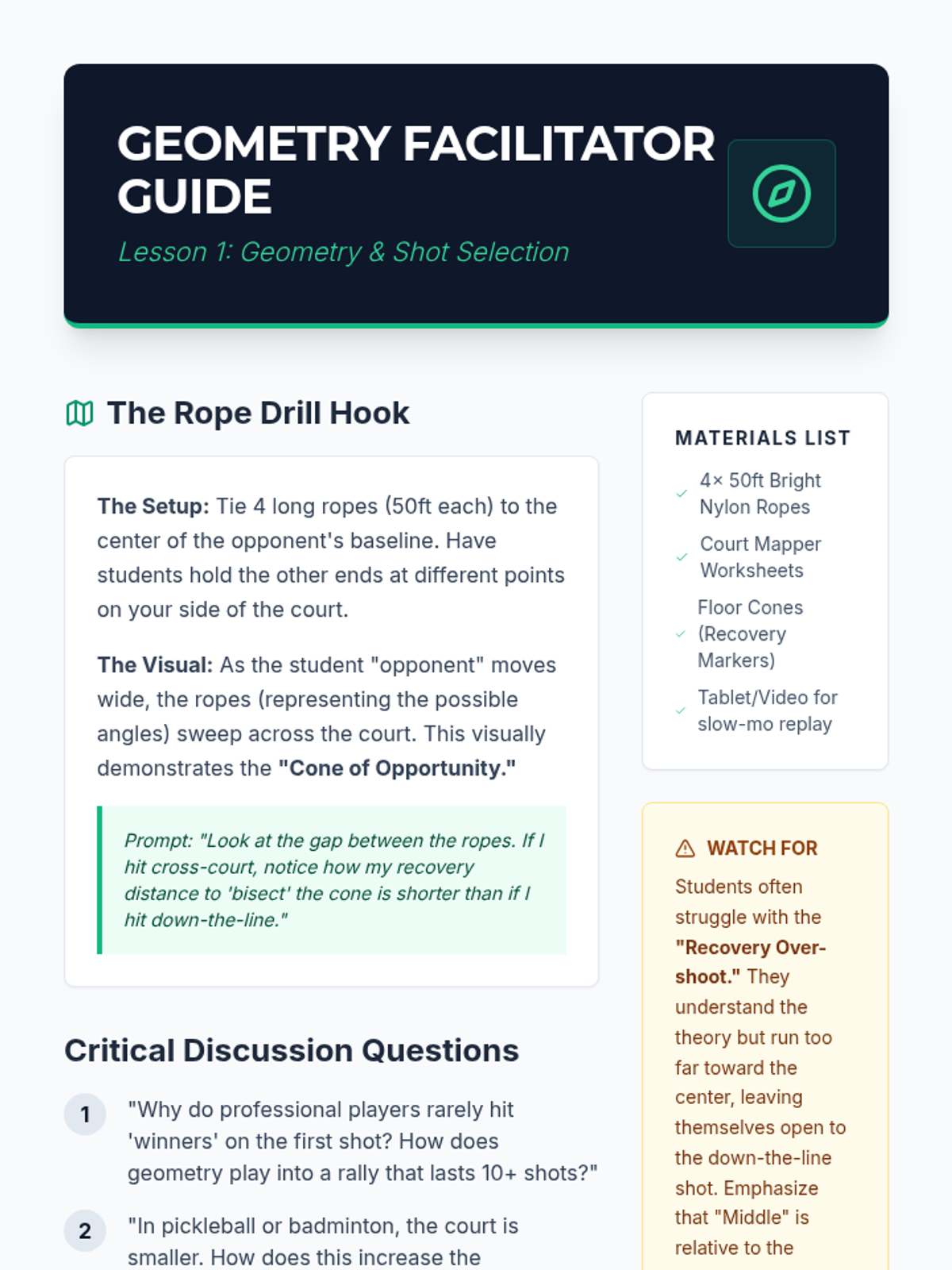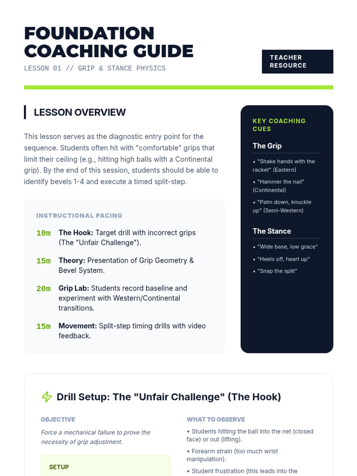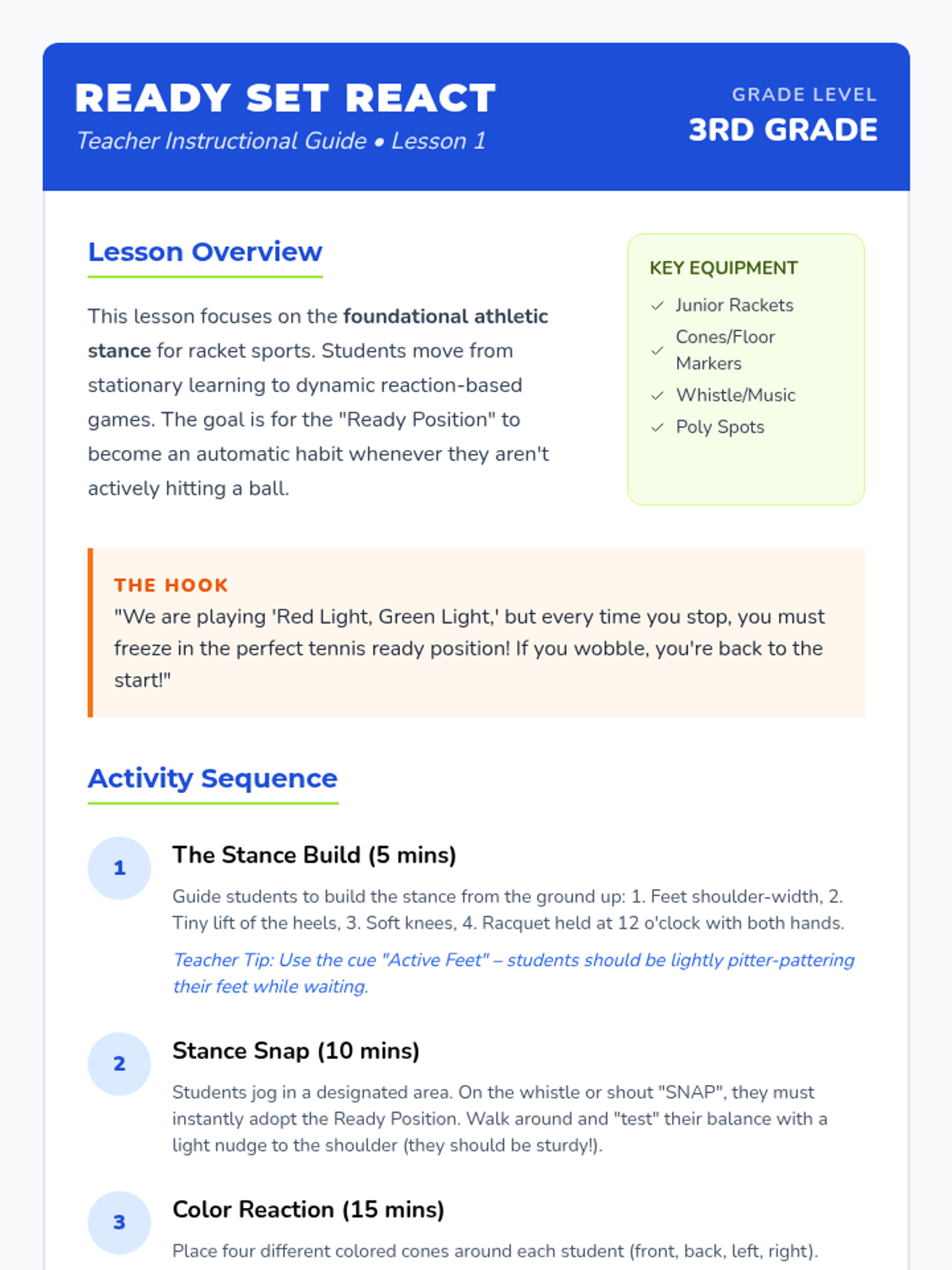 A comprehensive 4th-grade PE unit focused on the tactical and physical foundations of racket sports, including court positioning, cooperative rallying, finding open space, and defensive recovery. Students transition from basic athletic stances to complex strategic play.