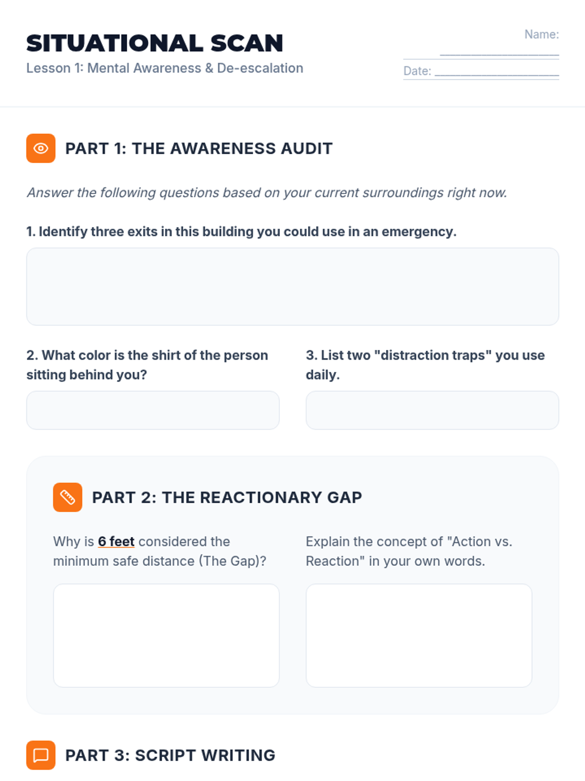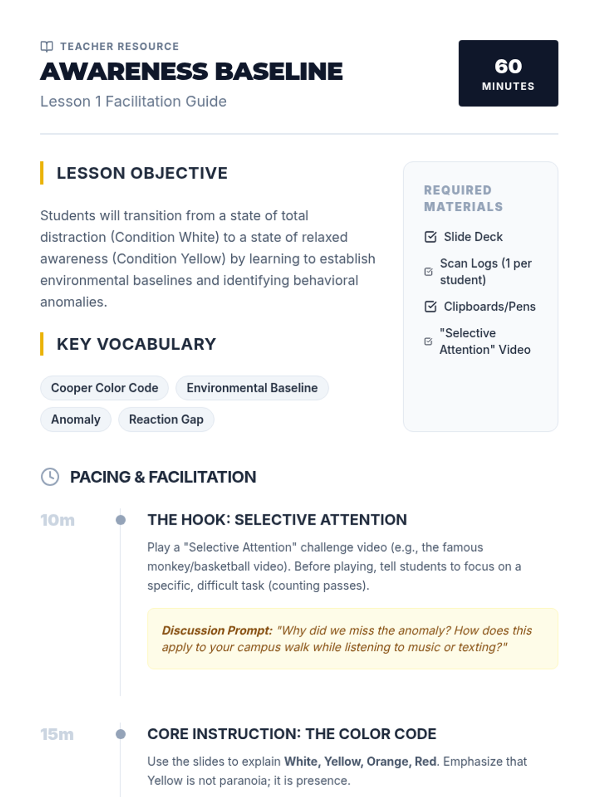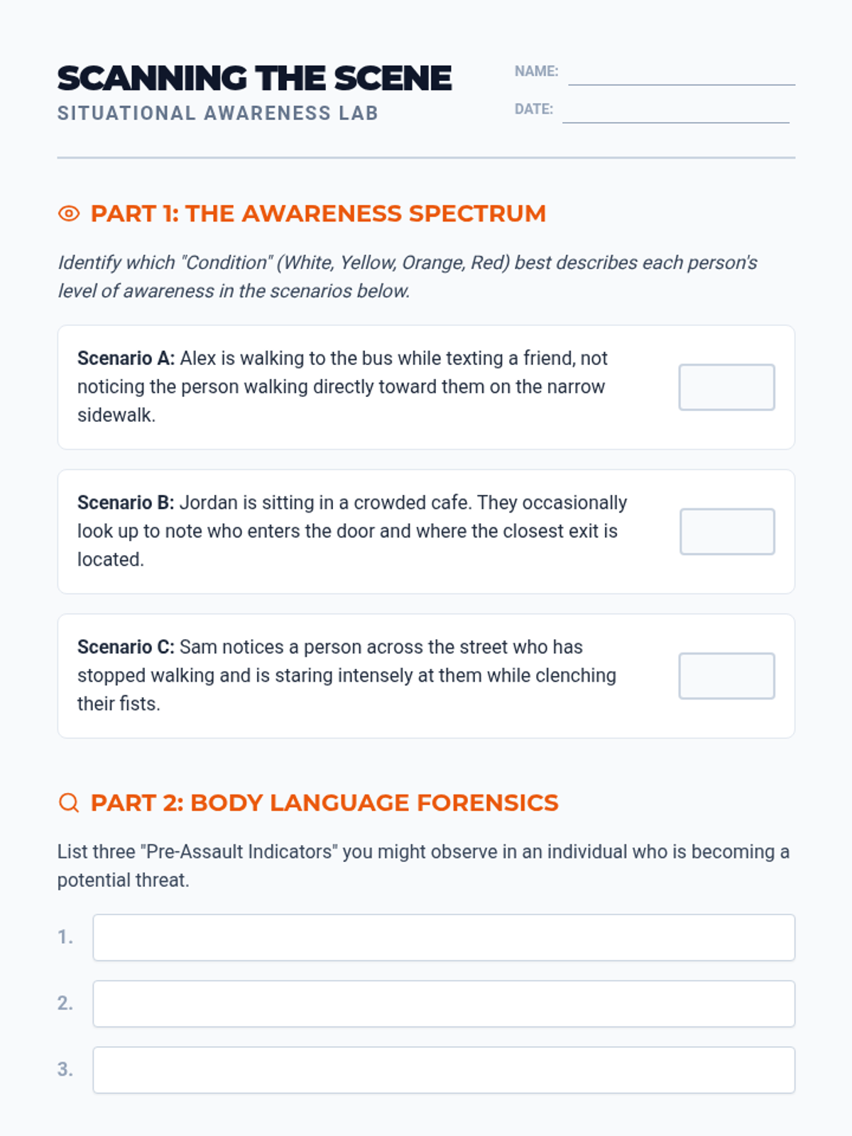 This introductory sequence focuses on the psychological and preventative aspects of self-defense for undergraduate students, prioritizing awareness, verbal de-escalation, and boundary setting. Students will progress from theoretical concepts like the Cooper Color Code to practical simulations involving physical distance management and wrist releases.